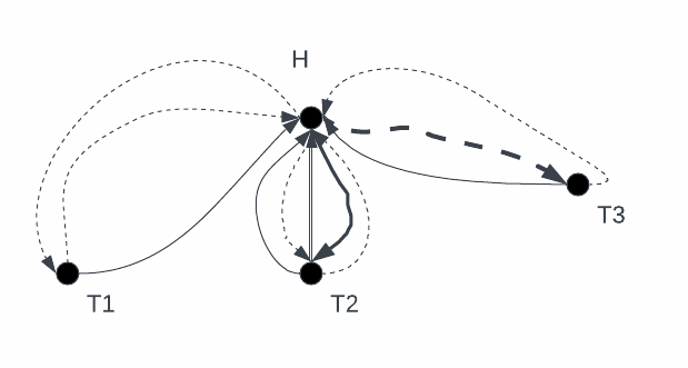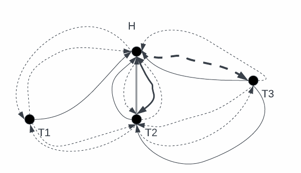 Диаграмма 5: Терпящий Т2 становится агентом воли Насильника, Т1 и Т3 вынуждены быть с ним в тех же отношениях (подчинение и взаимная ненависть).
