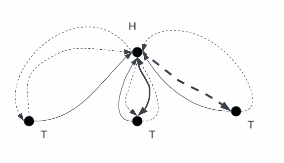 Пунктирные стрелки показывают травматические, негативные отношения. Пунктирная стрелка от Н к Т — это принуждение. Без принуждения Терпящий выйдет из отношения антагонизма и откажется выполнять приказы Насильника. Пунктирная стрелка от Терпящего к Насильнику — это ненависть Терпящего.