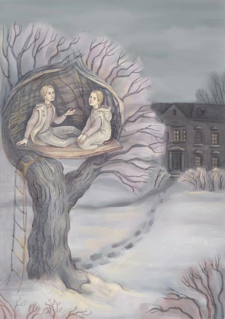 Полноразмер у автора. Это к самому началу цикла про братьев Лир. Тот самый первый рассказ, с которого все началось. Обветшалой домик на дереве, зима, мрачноватый дом на заднем плане. Аллегория семейных взаимотношений. У автора в ВК подробное описание. Я, как автор рассказа, очень рада, что Олли согласилась рисовать по мотивам этого цикла.