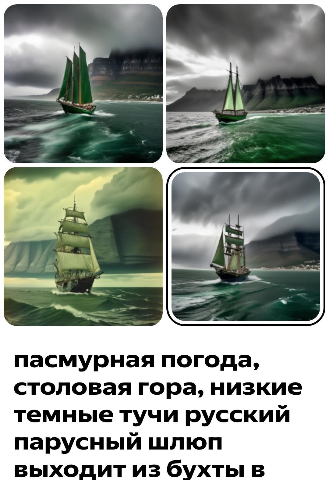 - "пасмурная погода, Кейптаунская бухта, столовая гора, русский парусный шлюп "Диана" под андреевский флагом выходит из бухты в штормящий зелёно-серый океан"