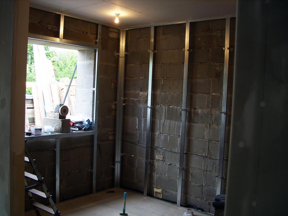 3. Ставим окна, делаем разметку будущих комнат, возводим профиль, проводим электрику (провода с разметкой под будущие розетки, выключатели и лампочки, обшиваем профиль гипсокартоном, шпаклюем, наждачим.