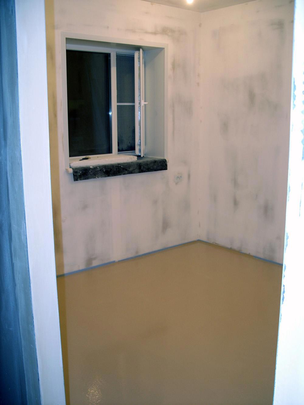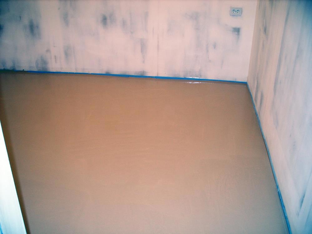 Финишируем пол в двух жилых комнатах и коридоре самовыравнивающейся смесью (на самом деле приходится попотеть, чтобы смесь "самовыровнялась, а учитывая, что застывает она быстро, попотеть пришлось вдвойне). Но вроде все получилось: