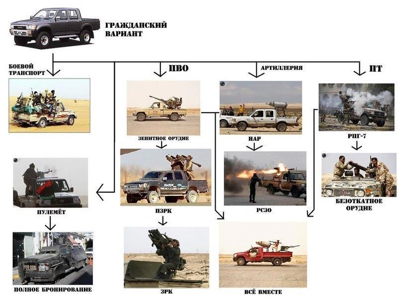 Оружие вполне может сочетаться с перевозкой грузов. Ибо совсем не обязано занимать всю грузоподъемность, а выбор между довезти меньше и гарантированно не довезти, очевиден. Так у дерева развития «Тойоты» в варианте с СПГ оружие и БК займут 70-80 кг, в варианте с ПТУР пусковая и два ТПК весят в пределах 50 кг. ЗУ-23-2 весит чуть меньше тонны, но при установке на грузовик место еще останется.