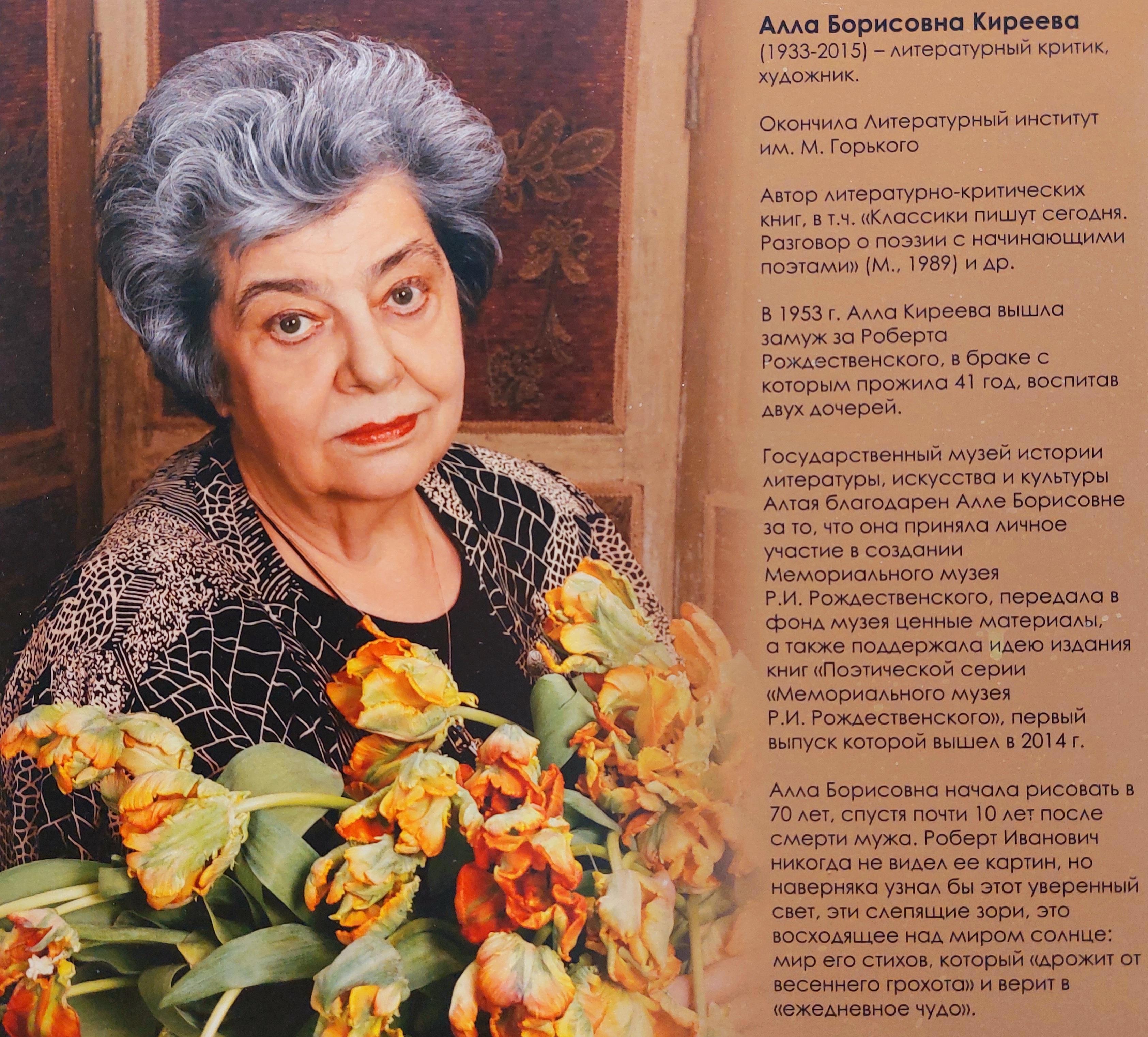Автор: Юлия Нифонтова«Алла Борисовна Киреева (1933 - 2015) - советская и российская писательница, литературный критик, вдова поэта Роберта Рождественского. Окончила литературный институт имени М. Горького. С Робертом Ивановичем они прожили 41 год, у них две дочери: Екатерина и Ксения Рождественские…»