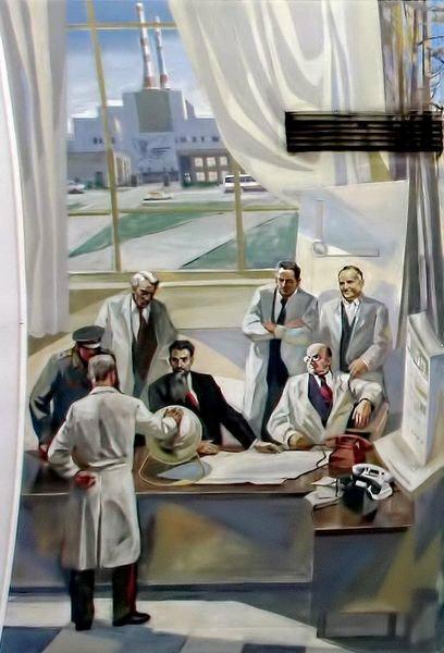 Демонстрация ядерного заряда. Л.П. Берия, Б.Л. Ванников, Е.П. Славский, М.В. Келдыш, И.С. Курчатов и С.П. Королёв. Фрагмент панно на вокзале г. Екатеринбурга.