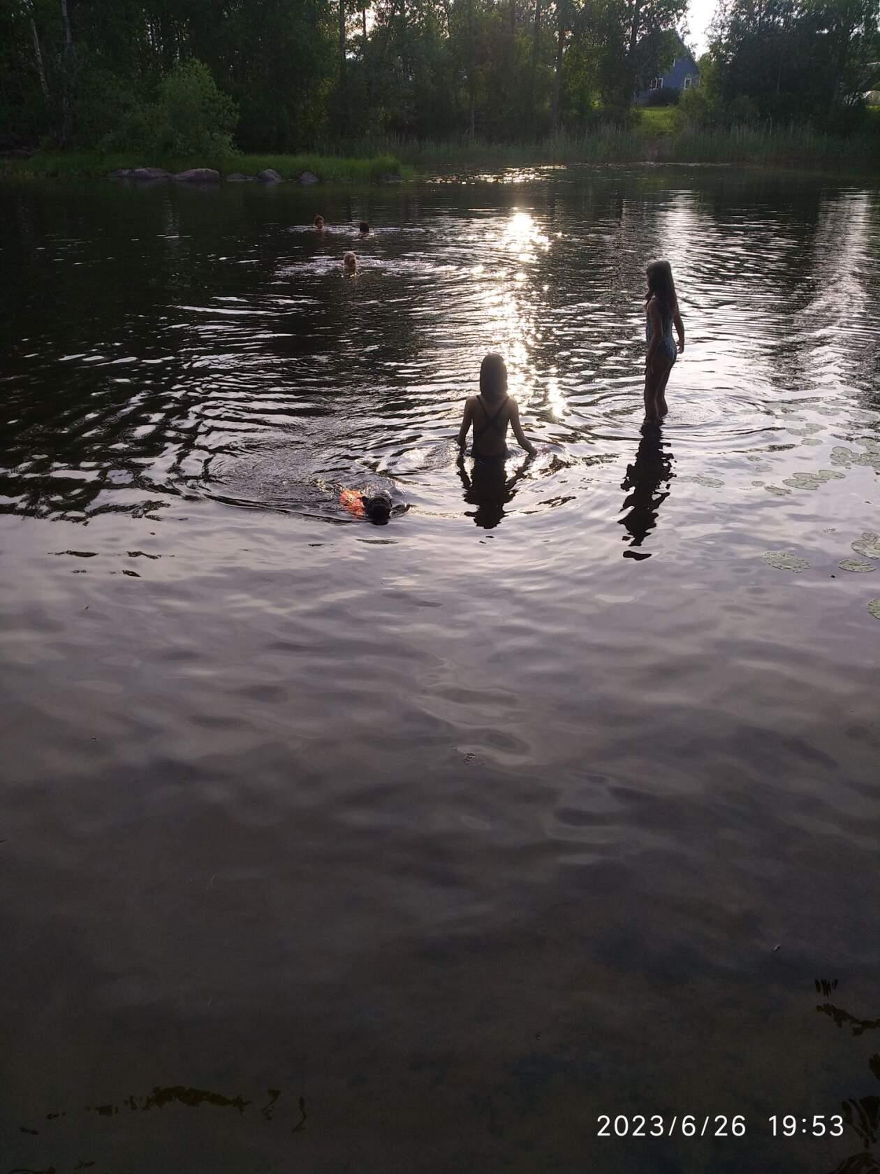 Дача встретила девчонок солнцем, и тихим голосом речки. Они сразу же побежали к воде. Боня сопровождала их звонким лаем. Папа надел на собачонку оранжевый жилет, и Боня сразу стала, одновременно, похожа и на спасателя, и на железнодорожника, и ещё на какого-то очень важного работника какой-то службы. Вода в речке была теплая, что доставляло и девочкам и собаке огромное удовольствие.