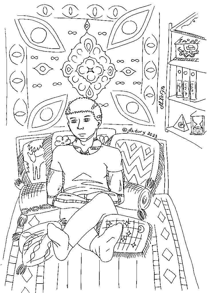 Самого хозяина портала в сказку народов Азии Э́ви увидела отдыхающим среди декоративных подушечек на застеленной красным бархатным покрывалом кровати. Она легко узнала его в лицо, хотя сейчас он не носил доспехов. Вместо них его крепкое тело осталось облачено лишь в белую майку и брюки. Волосы на голове коротко острижены, а на теле, как и у Рона, от всей конфигурации остались лишь области мягкой брони и полосы металла с разъёмами. От элькса́рима так и веяло ухоженностью и аккуратностью, словно мылом и стиральным порошком, – и это притом, что ещё каких-то пару часов назад он возвратился с боевой операции.