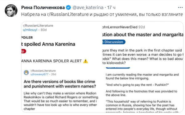 Автор: Павел ЛисинПользовательница твиттера, Рина Поличенкова, обнаружила на Reddit раздел, посвящённый русской литературе, в котором иностранцы обсуждают произведения русской классики и современной прозы.