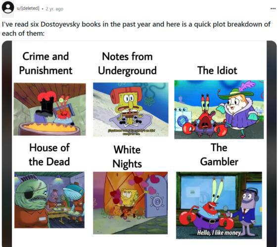 Помимо забавных вопросов в сабреддите встречаются и литературные мемы. Например, один из поклонников Достоевского «пересказал» прочитанные произведения с помощью кадров из мультсериала «Губка Боб Квадратные штаны».