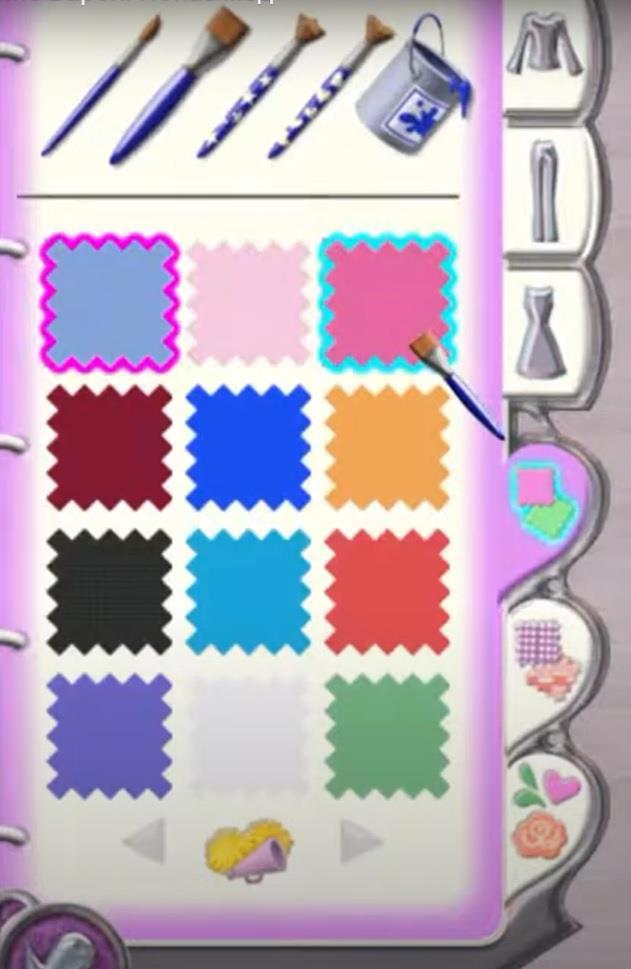- Нет многослойности в одежде. То есть в игре из видов одежды лишь верх, низ и платье. Никаких курток, пальто и т.д. Здесь приведена часть основной игровой панели "Дизайнерский стол". Справа вверху обозначены вкладки с имеющимися видами одежды.