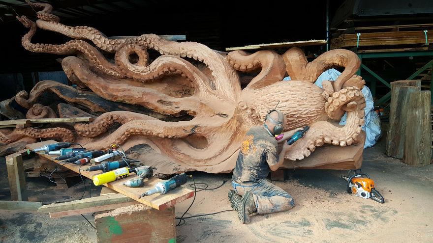 Когда большинство из нас видит упавшее дерево, мы обычно видим, ну, в общем, упавшее дерево. Но когда Джеффри Майкл Самудоски видит упавшее дерево, он видит целый мир возможностей. Он мастер по изготовлению бензопил, который работает в Гиг-Харборе, штат Вашингтон, и, как вы можете видеть на примере этого гигантского тихоокеанского осьминога, он может превращать дерево в самые невероятные скульптуры.