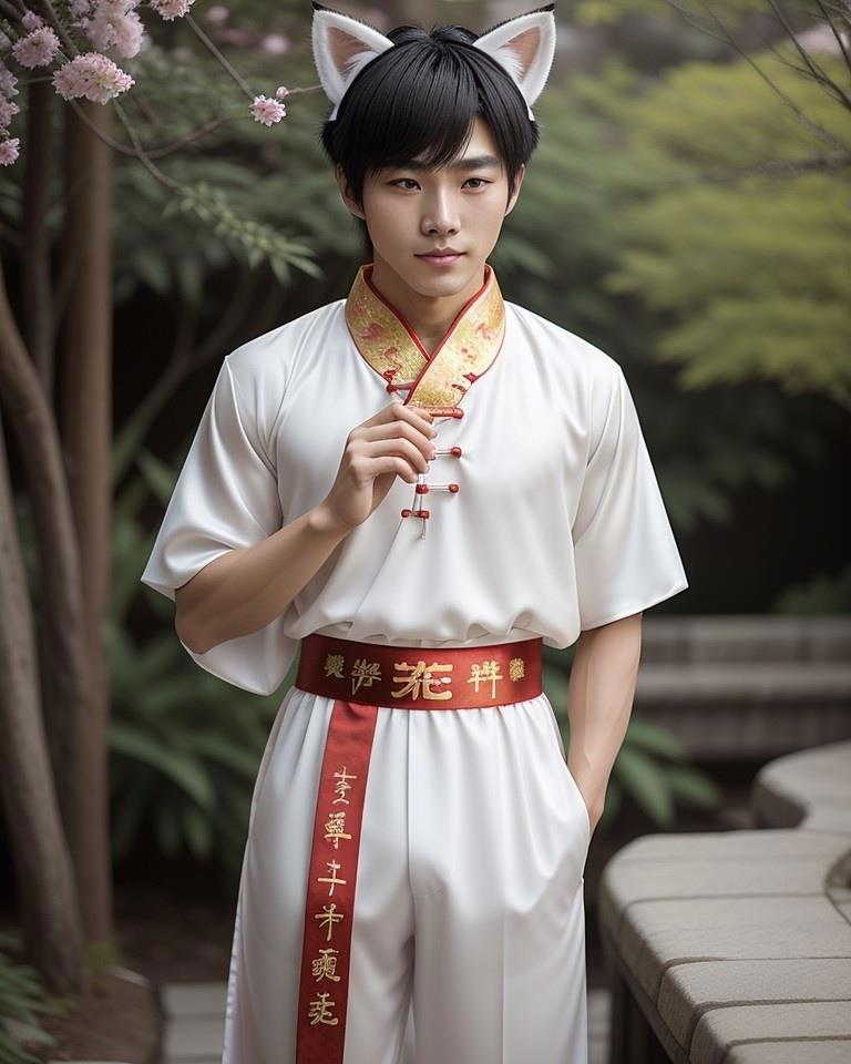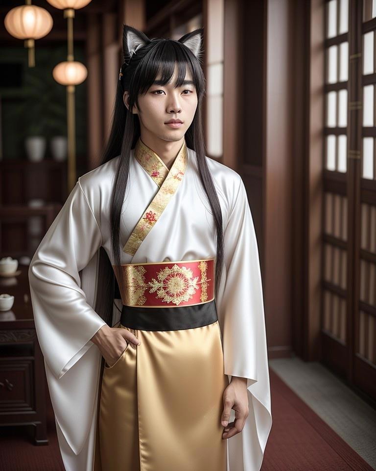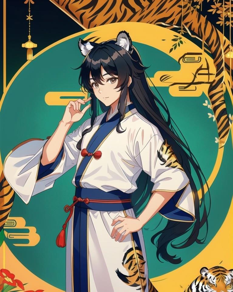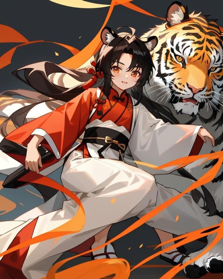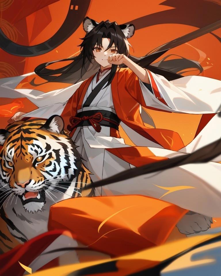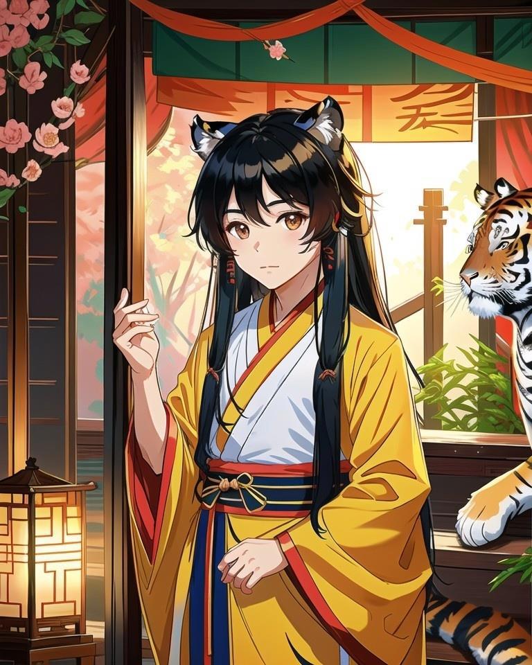 Это Цзинь Веньхуа - полудемон-получеловек. А еще у него в предках были золотые крылатые тигры, поэтому у него с детства пара пушистых тигриных ушек.