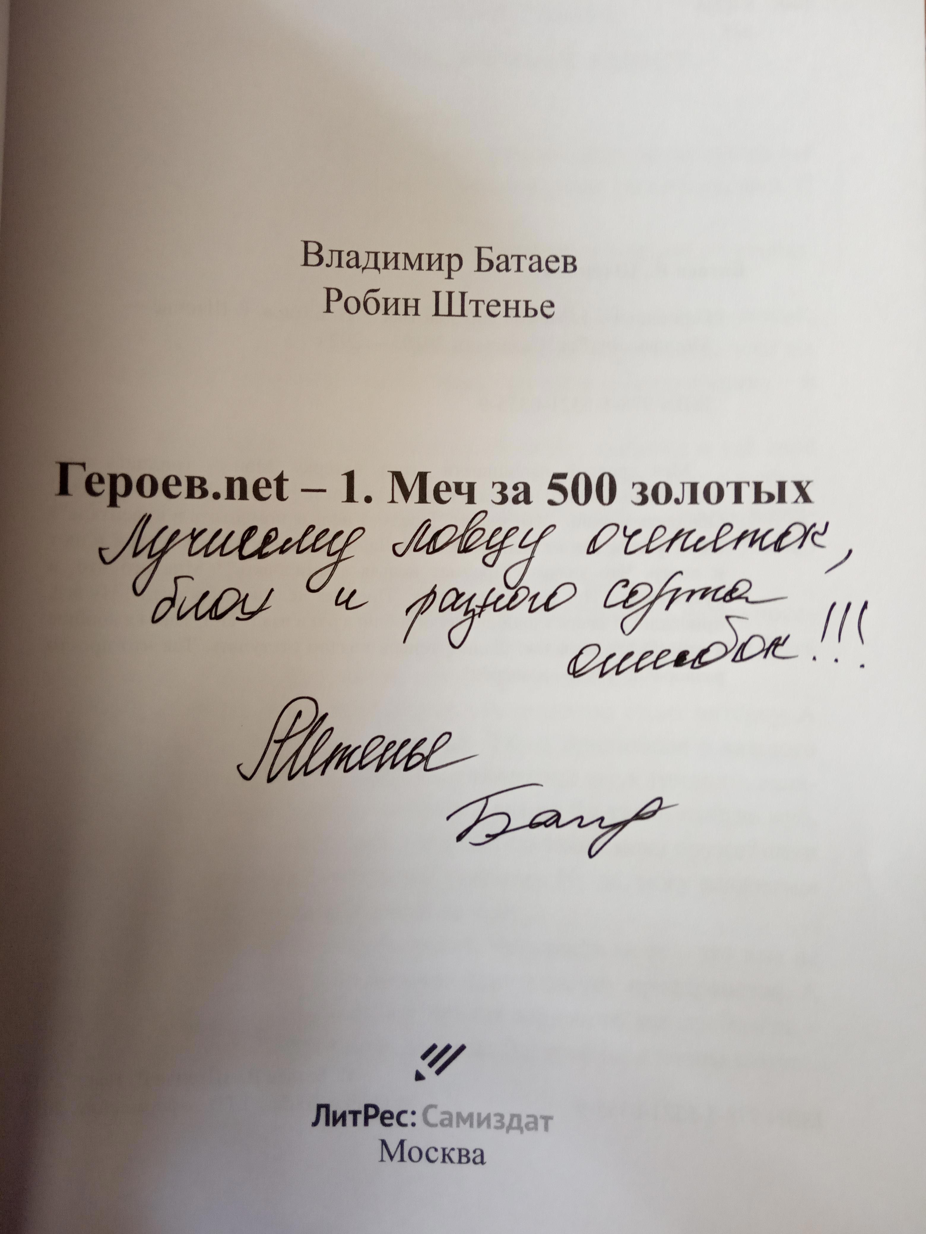 А я вчера наконец-то получила долгожданный презент - книгу Робина Штенье и Джокера JKRВладимира Батаева "Меч за 500 золотых" с автографами авторов!!!