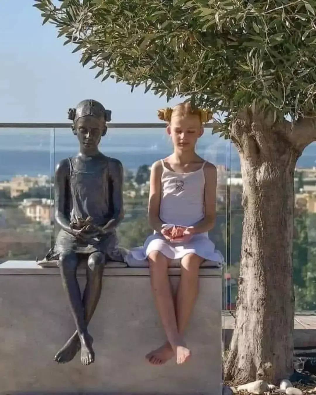 Бронзовая скульптура киприота Йиота Лоанниду "Девочка с воробьем" в старом городе Пафос