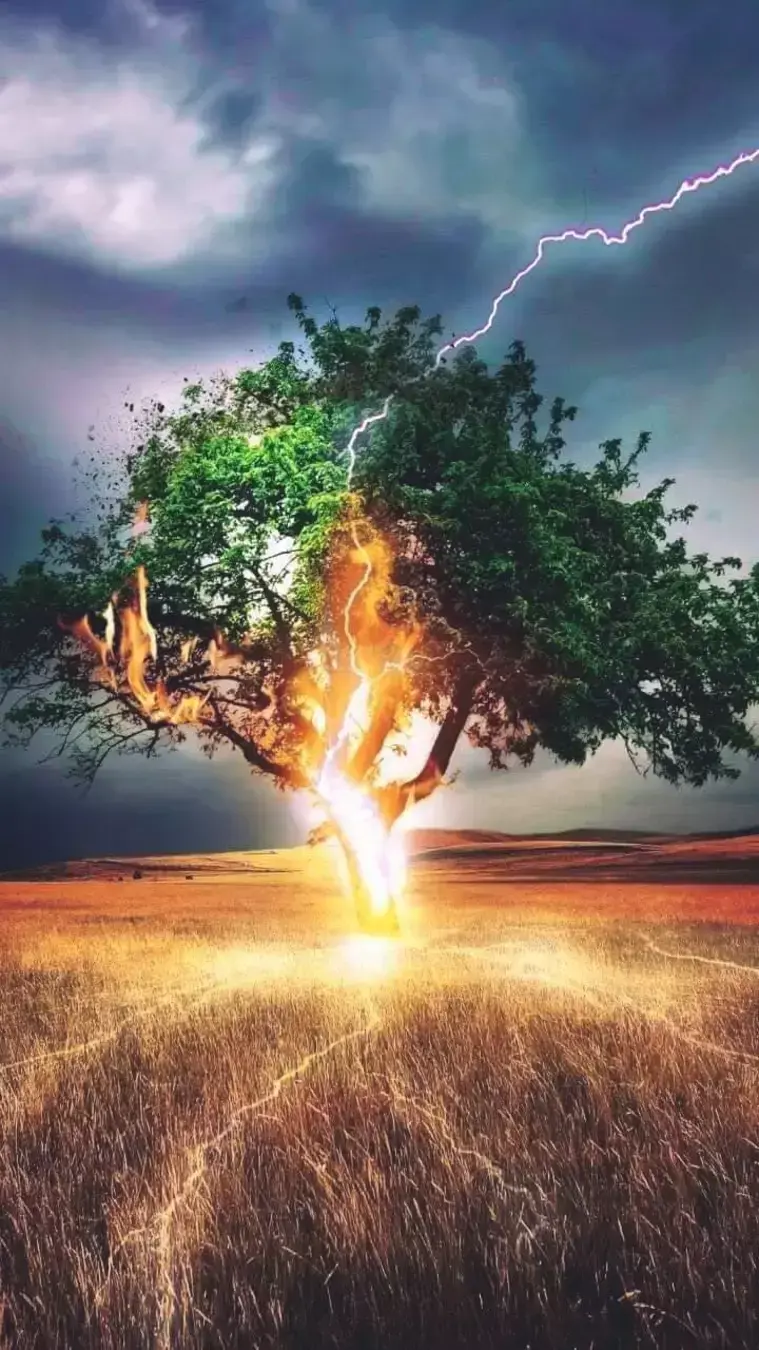 Удар молнии в дерево. Красиво, но очень губительно.