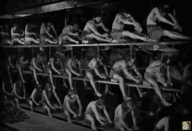 Мессала приговаривает Иуду служить в римском флоте в качестве галерного раба. В сценах на галерах мы видим внутреннюю трёхрядную рассадку гребцов, отражающую тогдаршие представления историков о конструкции трирем. Обратите внимание на «стремена» зигитов. Разумеется, сейчас такое не выдерживает критики, но это 1925 год.