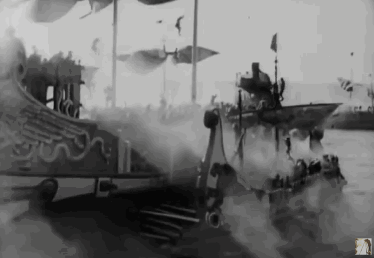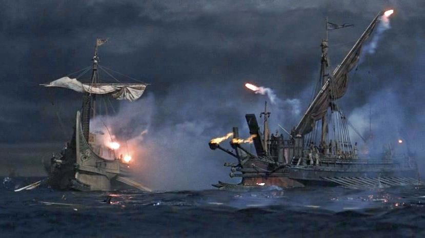 Несмотря на причудливые, придуманные штрихи, например, когда пираты бросают стеклянные сферы, наполненные шипящими змеями, на палубу римского судна, морское сражение хорошо сделано с исторической точки зрения (и тогдашних представлений о тактике древнего морского сражения). Впрочем, и тогда и сейчас в кино довольно большой акцент делается на применении в античном морском сражении катапульт, стреляющих чем-то горючим. Источники подтверждают факты установки на корабли метательной артиллерии, но историки эти сообщения интерпретируют по-разному. Например, Мюррей считает, что полиеры со времён своего рассвета при Деметрии Полиоркете артиллерию применяли лишь при осаде портов. Например, при знаменитой осаде Родоса. Возможно, так и было. Я полагаю, что использование палинтонов, т.е. машин, метающих ядра навесом, в морском сражении было бы неэффективно из-за сложностей с прицеливанием. Эвтитоны, метающие большие стрелы по настильной траектории представляются более эффективными, но гораздо менее эффектными. Красивые дымные арки от горящих снарядов зрелищнее. В описании Полибия о Хиосском сражении (201 г. до н.э.) между македонским флотом Филиппа V и объединёнными силами Пергама, Родоса, Византия и Кизика огненные средства упоминаются, но вот средства их доставки совсем иные. Мы ещё упомянем их ниже, когда пойдёт речь о фильме 1959 года.
