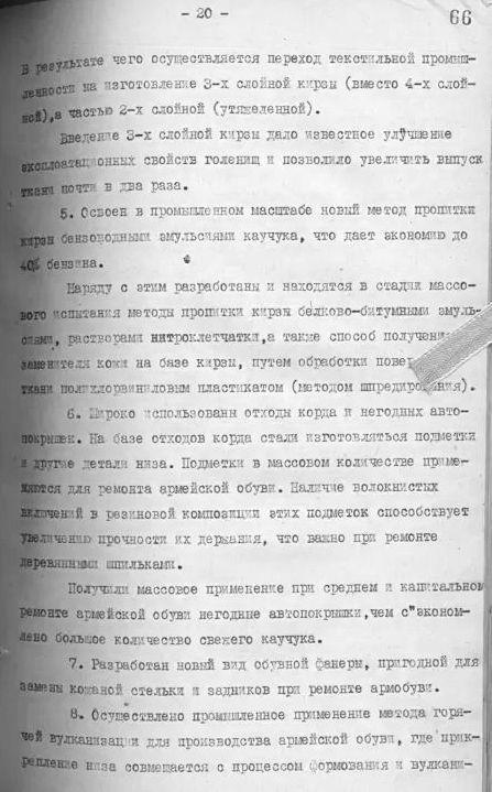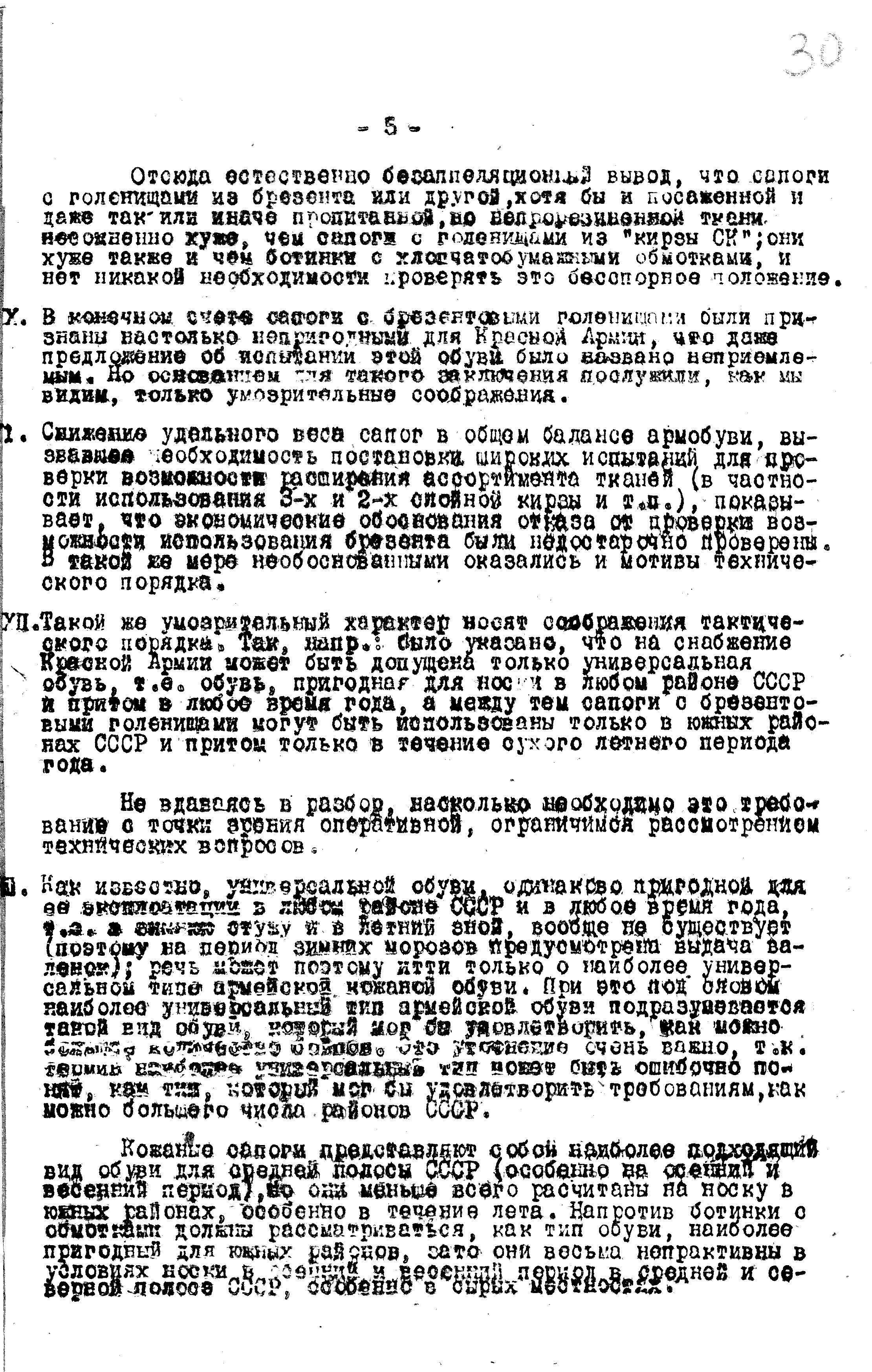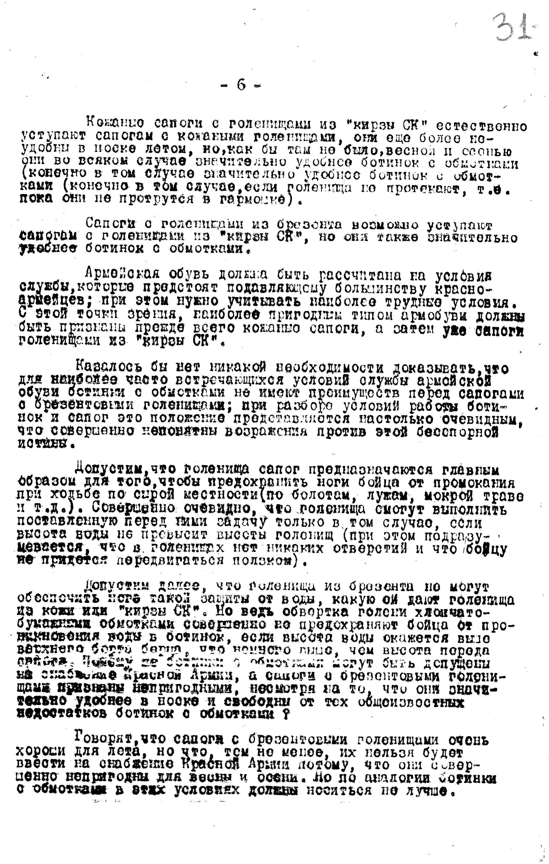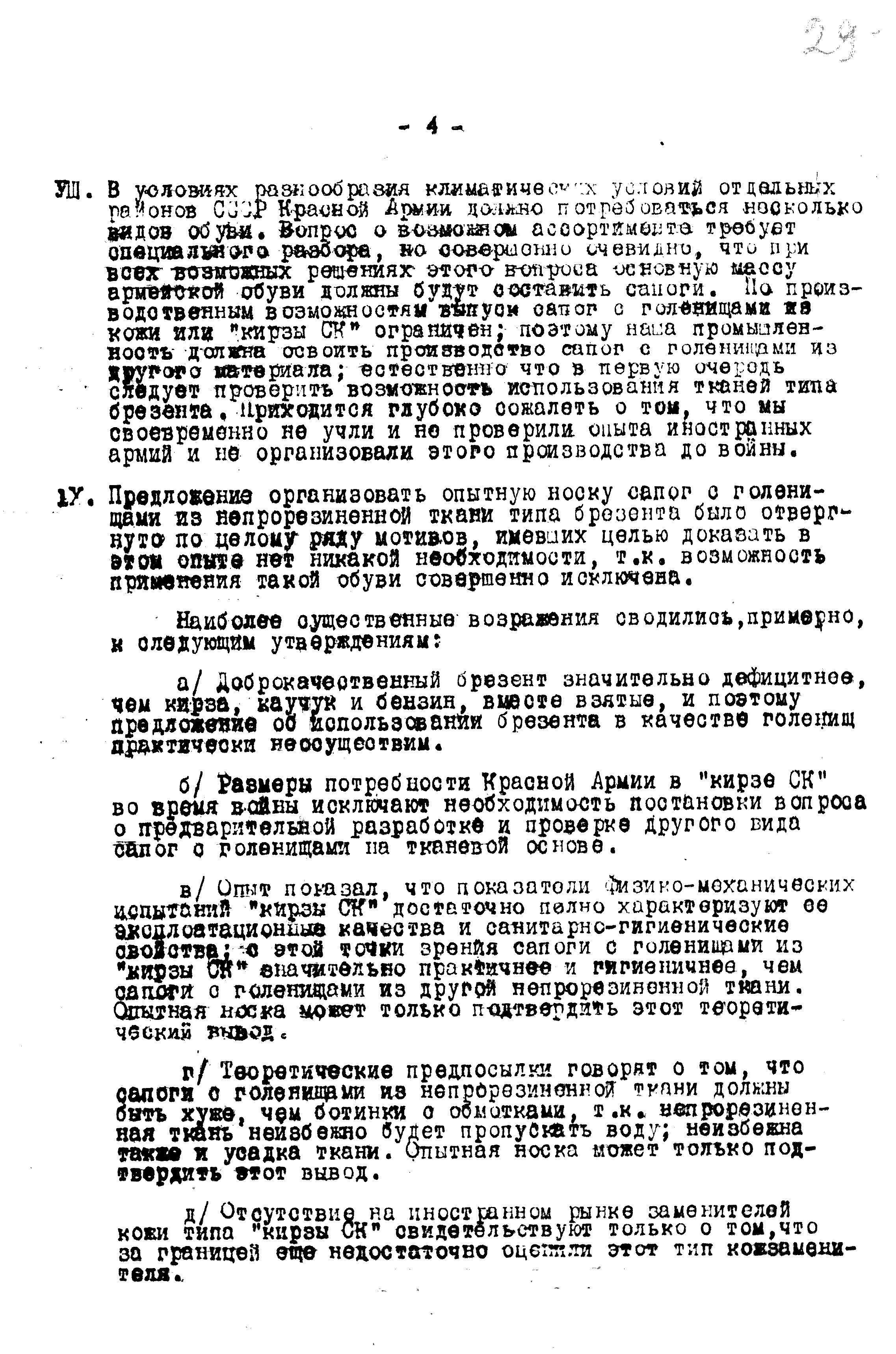 4. Сапоги с голенищами из не прорезиненной ткани возможно не уступают сапогам с голенищами из «кирзы СК» и, уже во всяком случае, лучше ботинок с обмотками; поэтому нужно, как можно скорей, испытать их в опытной носке, чтоб окончательно проверить возможность их использования для нужд Красной Армии.