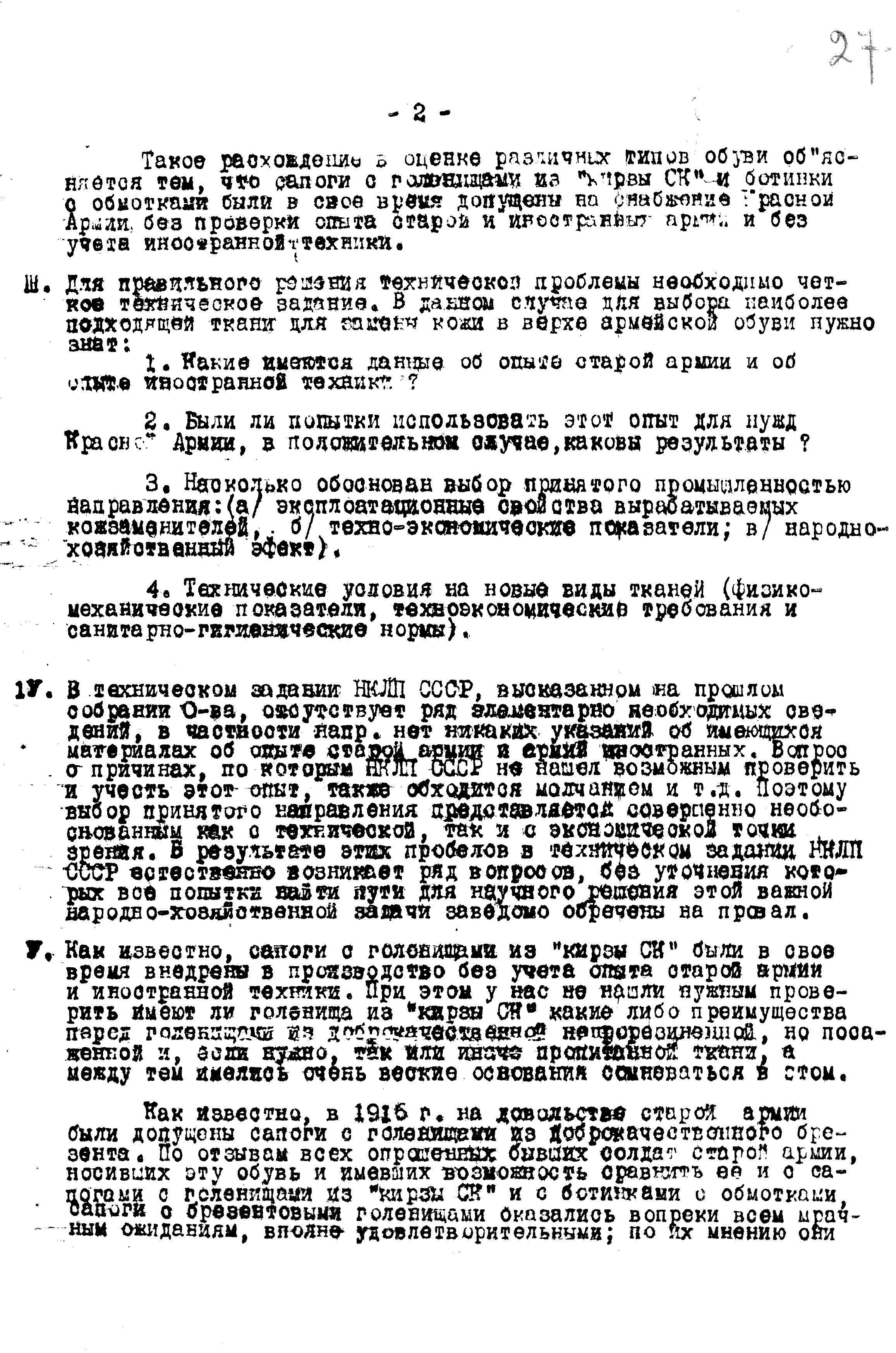 IV. В техническом задании НКЛП СССР[2], высказанном на прошлом собрании О(бщест)ва, отсутствует ряд элементарно необходимых сведений, в частности напр.имер нет никаких указаний об имеющихся материалах об опыте старой армии и армий иностранных. Вопрос о причинах, по которым НКЛП СССР не нашел возможным проверить и учесть этот опыт, также обходится молчанием и т.д. Поэтому выбор принятого направления представляется совершенно необоснованным как с технической, так и с экономической точки зрения. В результате этих пробелов в техническом задании НКЛП СССР естественно возникает ряд вопросов, без уточнения которых все попытки найти пути для научного решения этой важной народно-хозяйственной задачи заведомо обречены на провал.