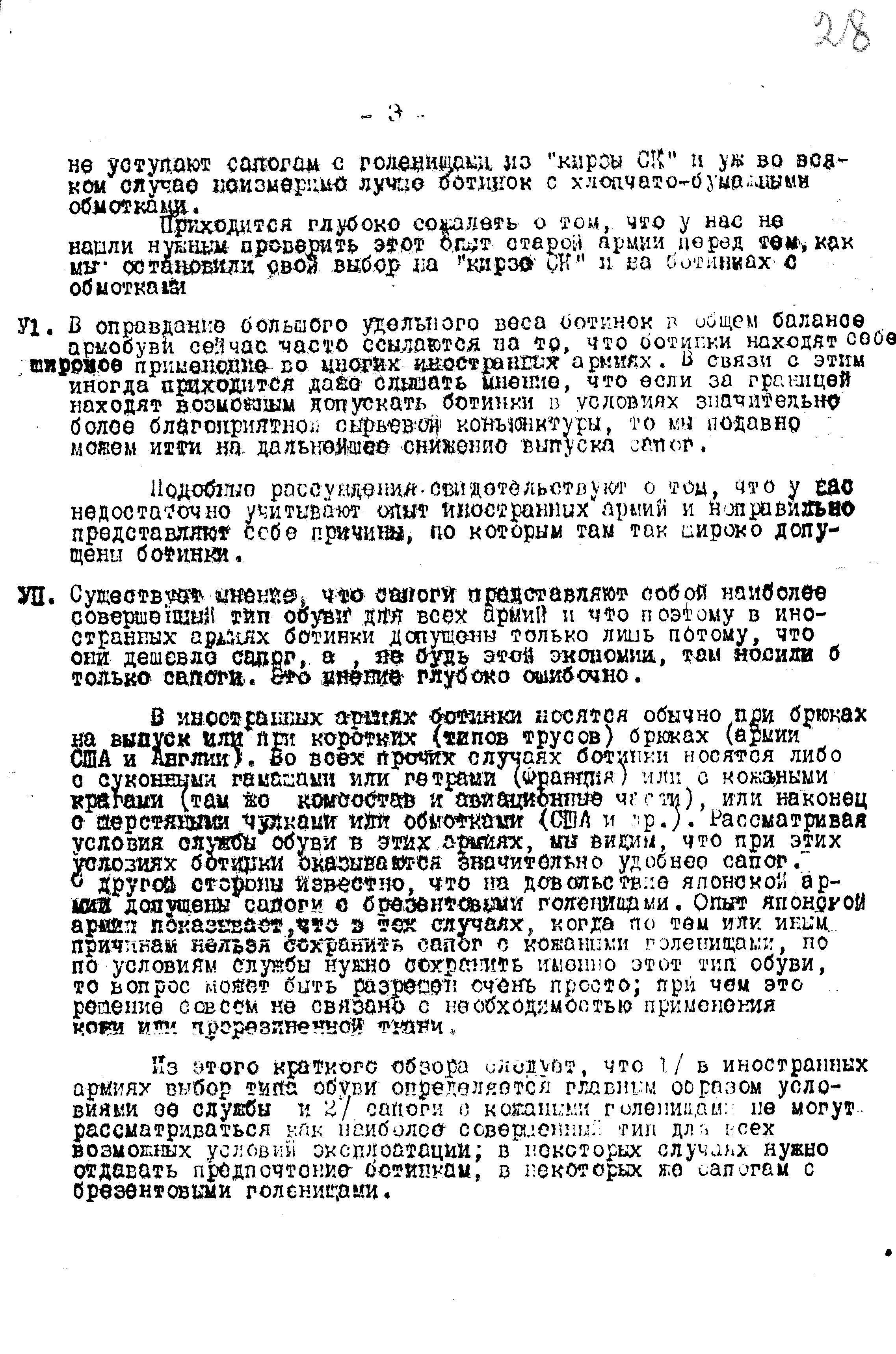 VI. В оправдание большого удельного веса ботинок в общем балансе армобуви сейчас часто ссылаются на то, что ботинки находят себе широкое применение во многих иностранных армиях. В связи с этим иногда приходится даже слышать мнение, что если за границей находят возможным допускать ботинки в условиях значительно более благоприятной сырьевой конъюнктуры, то мы подавно можем итти на дальнейшее снижение выпуска сапог.