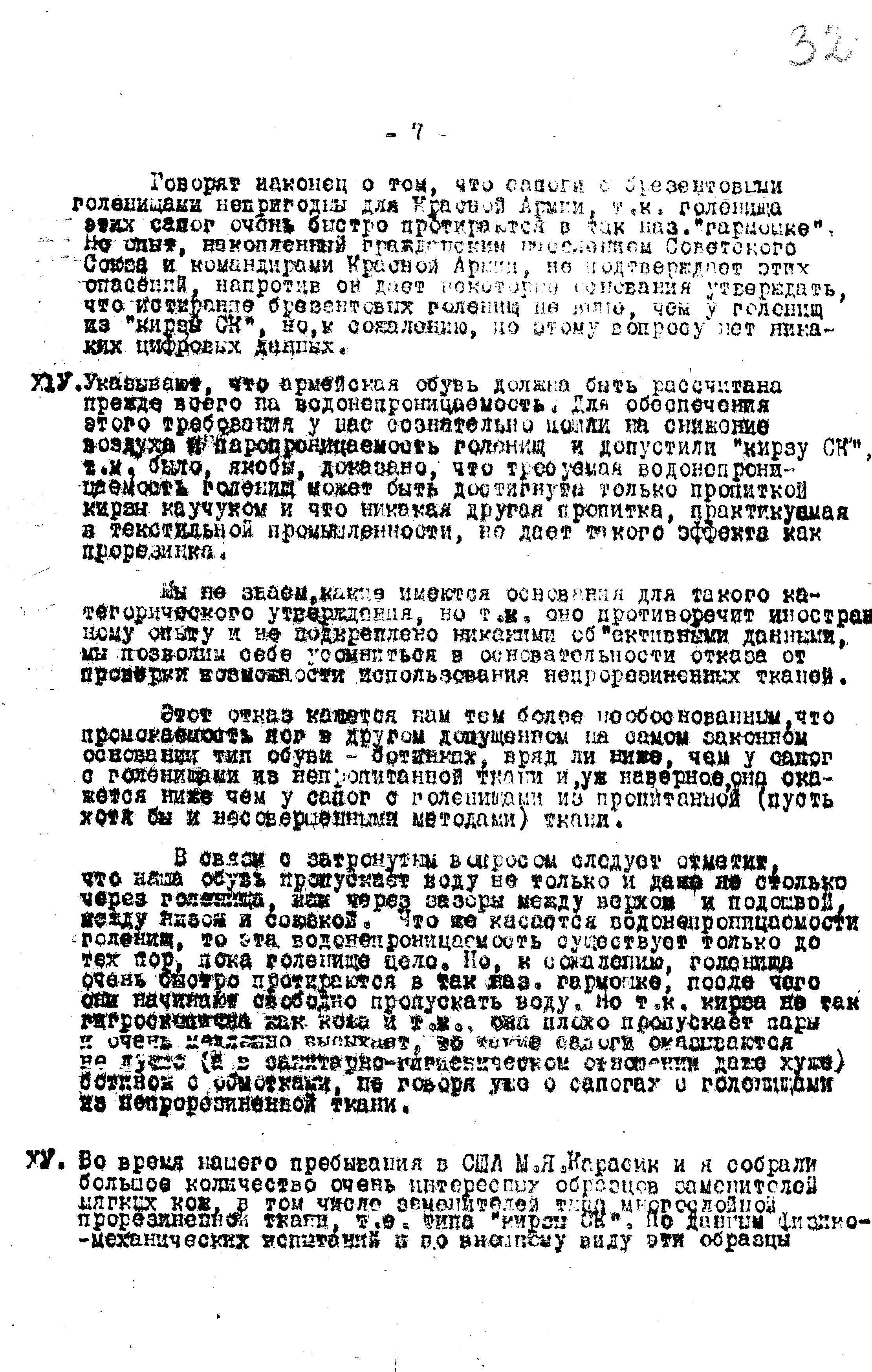 ХV. Во время нашего пребывания в США М. Я. Карасик и я собрали большое количество очень интересных образцов заменителей мягких кож, в том числе заменителей типа многослойной прорезиненной ткани, т.е. типа «кирза СК». По данным физико-механических испытаний и по внешнему виду эти образцы не только не уступают «кирзе СК», но и намного превосходят её, но тем не менее для пошивки обуви заменители этого типа нигде не применяли. По разъяснениям авторитетных специалистов, с которыми нам удалось беседовать по этому вопросу, материалы этого типа производятся в США уже давно, но только для целей изготовления галантерейных и т.п. изделий; в обувном же производстве они применения не нашли, вследствие своих общеизвестных отрицательных санитарно-гигиенических свойств (малая воздухопроводность и паропроницаемость, высокая теплопроводность и теплоемкость и т.д.). Возможно, конечно, что нас неправильно информировали, но, во всяком случае, подобное единодушное предостережение обязывало нас проверить эти указания.
