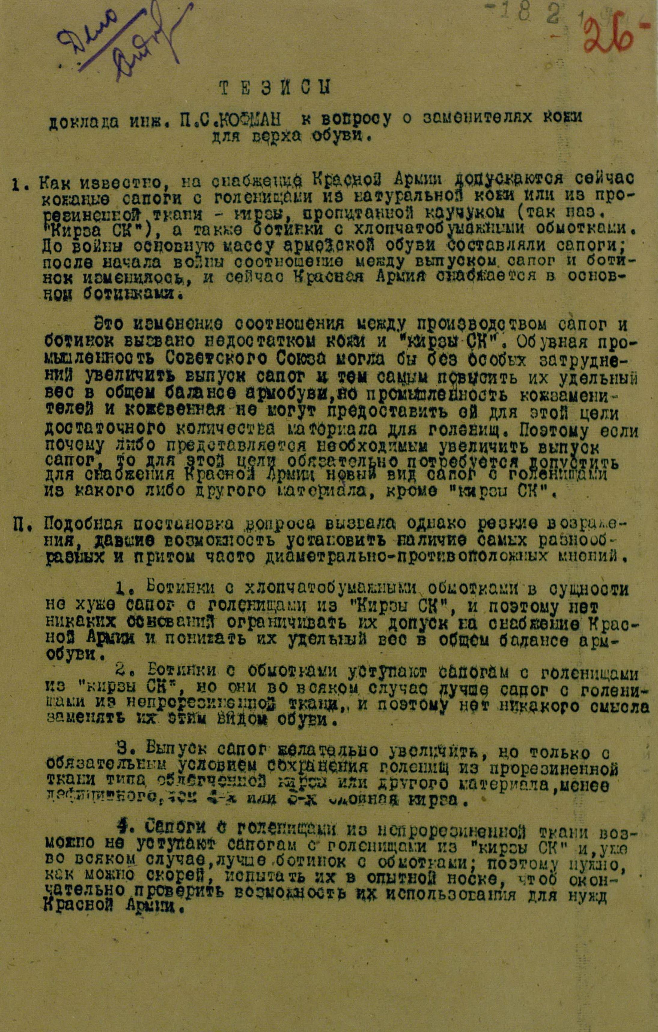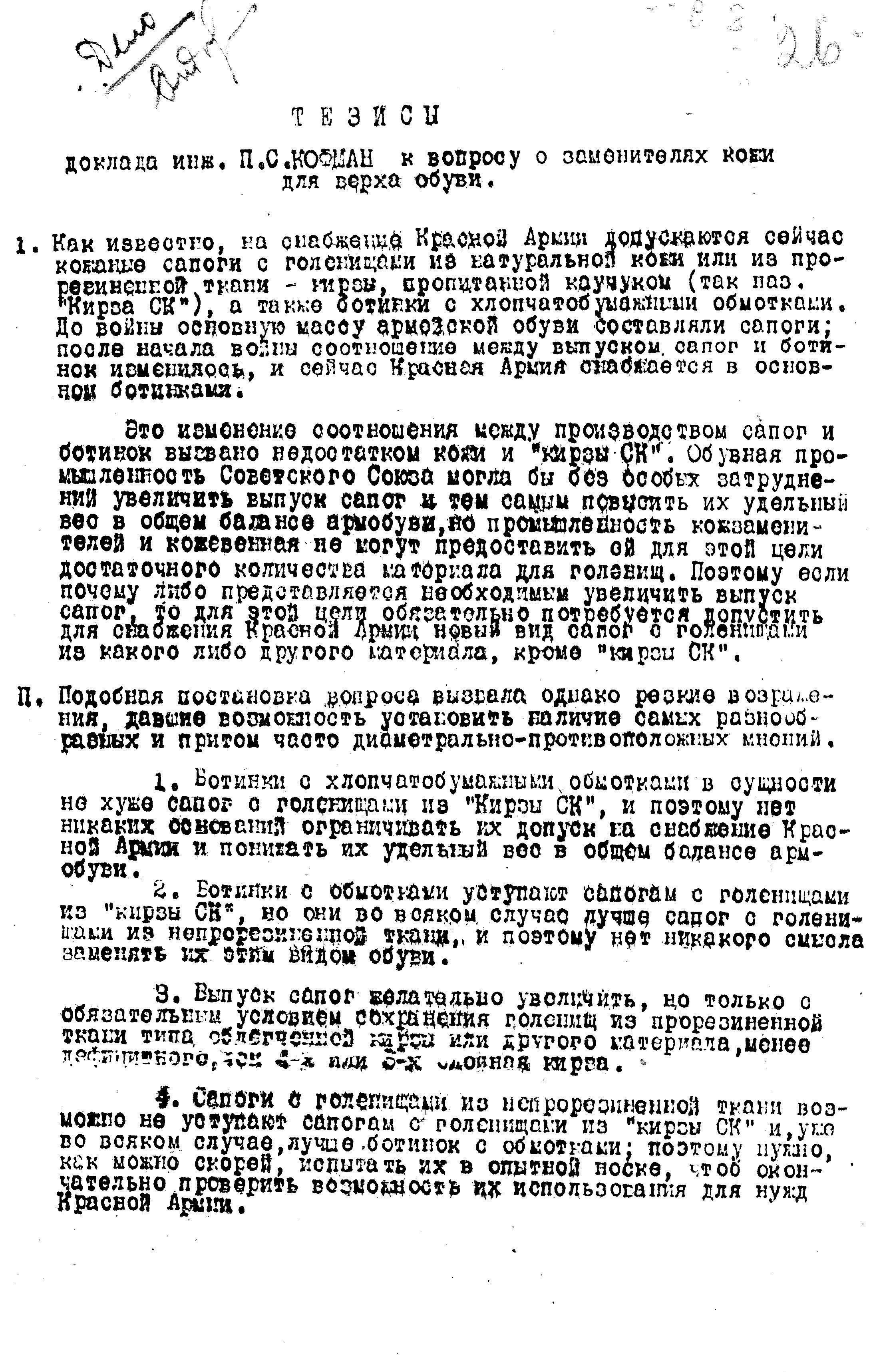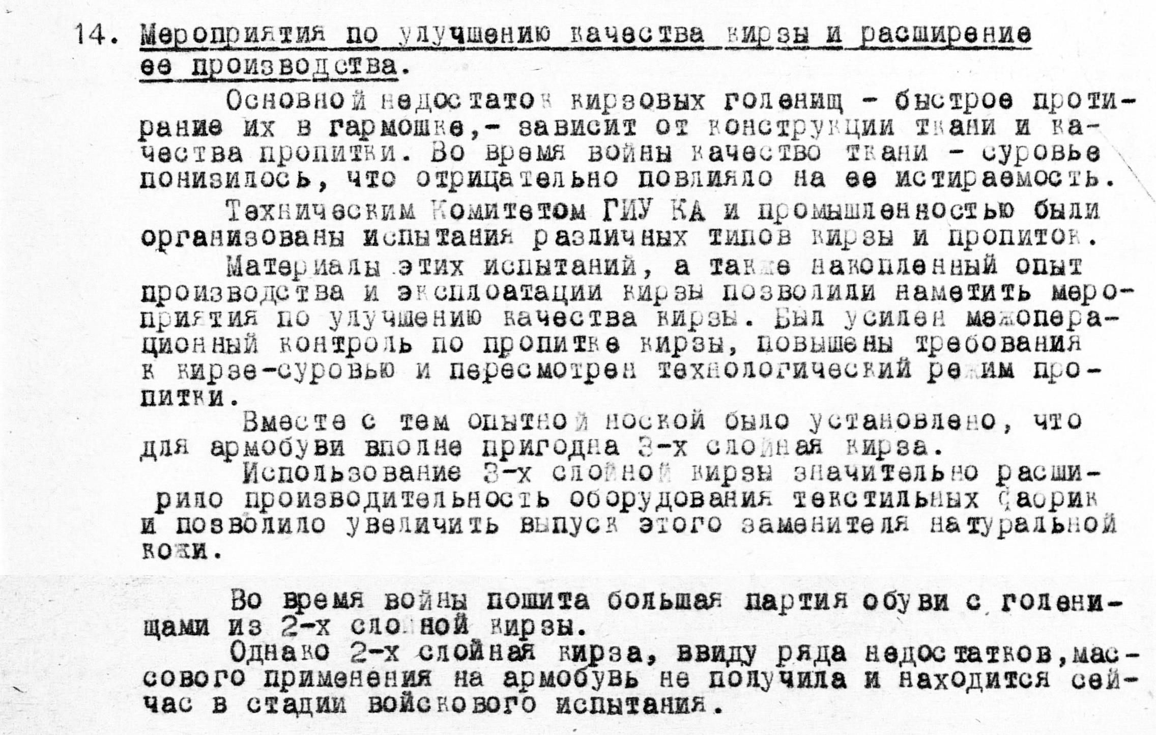 б/ Размеры потребности Красной Армии в «кирзе СК» во время войны исключают необходимость постановки вопроса о предварительной разработке и проверке другого вида сапог с голенищами на тканевой основе.