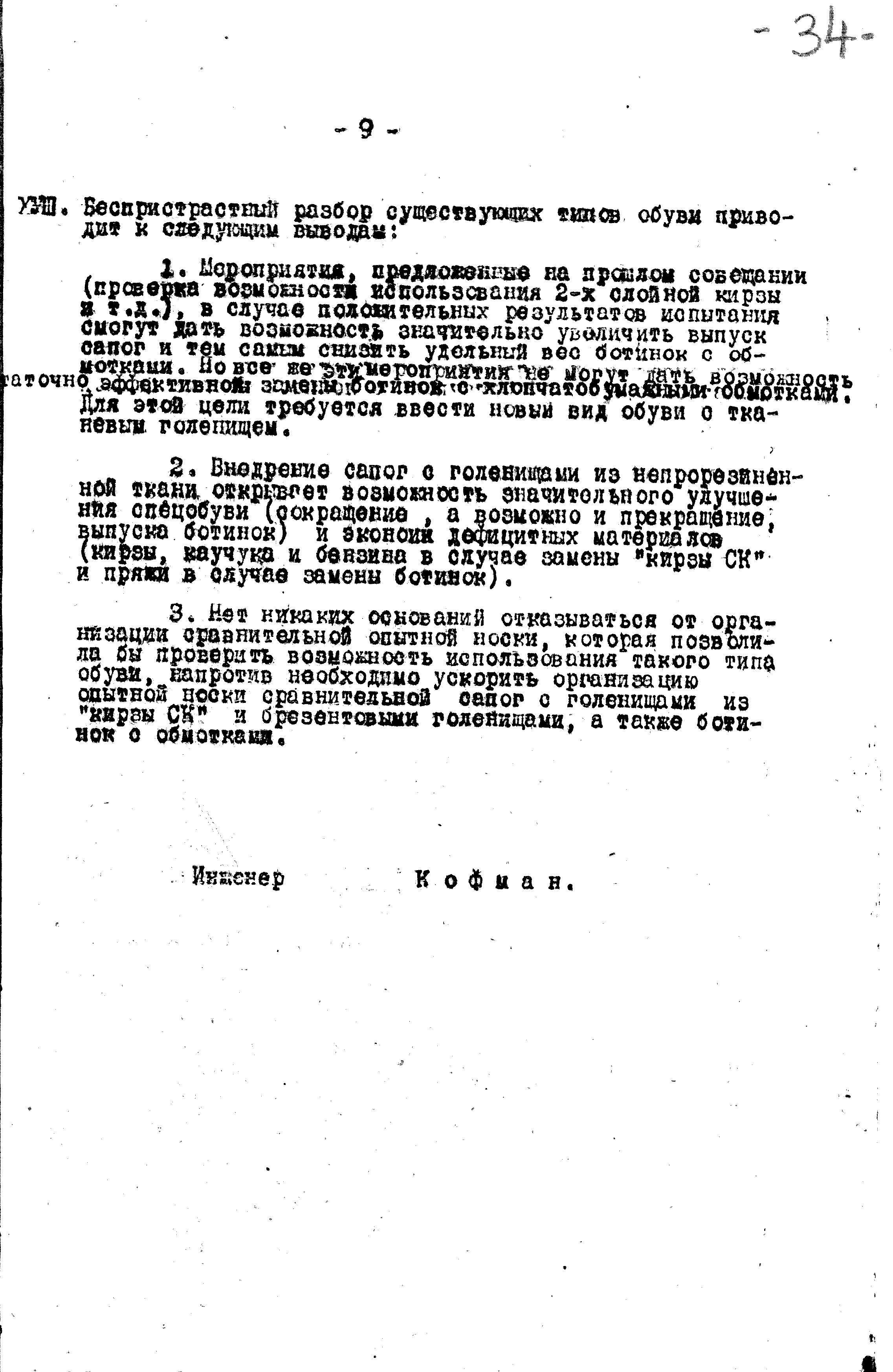 1. Ботинки с хлопчатобумажными обмотками в сущности не хуже сапог с голенищами из «Кирзы СК», и поэтому пет никаких оснований ограничивать их допуск на снабжение Красной Армии и понижать их удельный вес в общем балансе армобуви.
