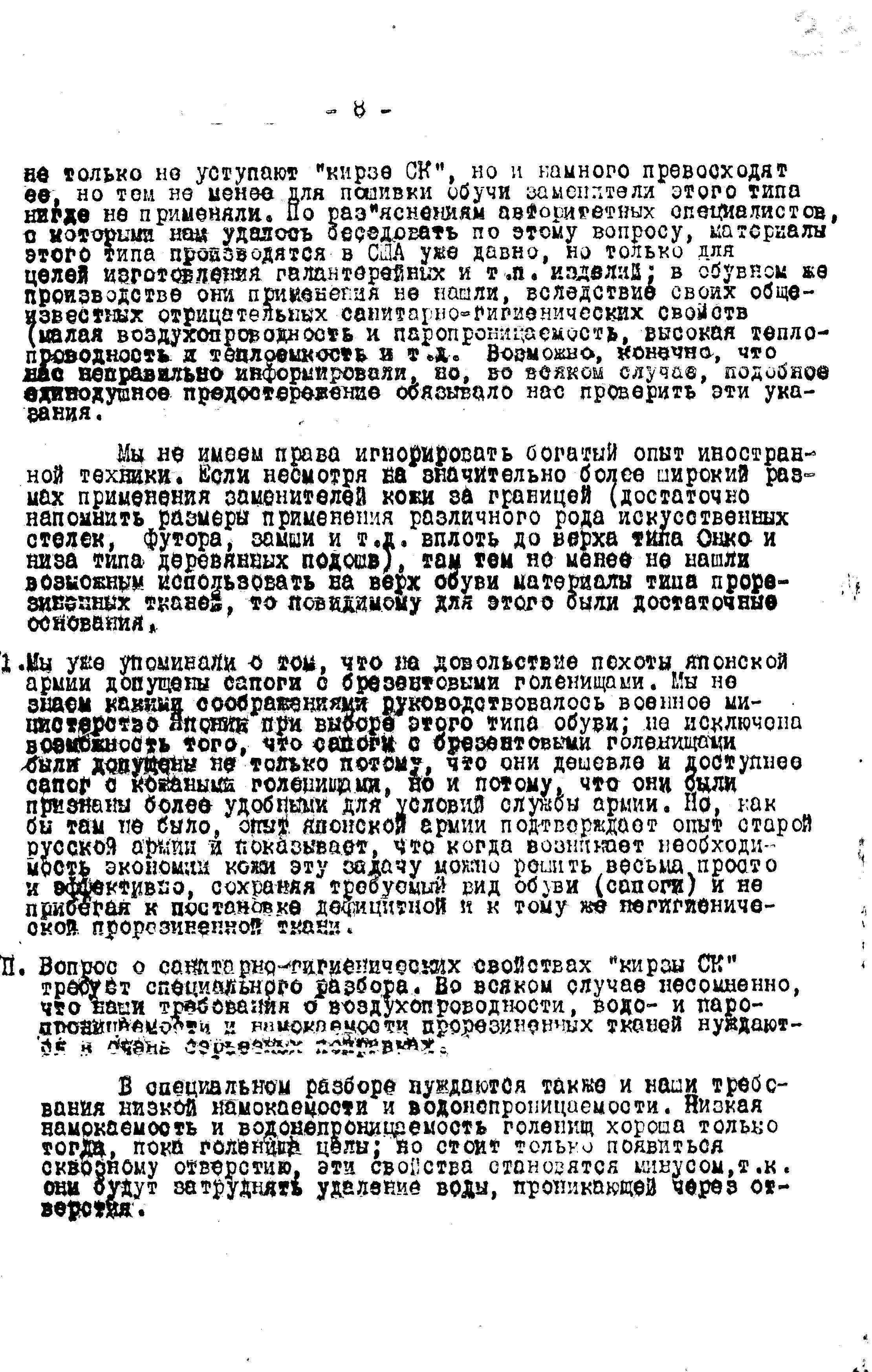 V. Как известно, сапоги с голенищами из «кирзы СК» были в своё время внедрены в производство без учета опыта старой армии и иностранной техники. При этом у нас не нашли нужным проверить имеют ли голенища из «кирзы СК» какие-либо преимущества перед голенищами из доброкачественной не прорезиненной, но посаженной и, если нужно, так или иначе пропитанной ткани, а между тем имелись очень веские основания сомневаться в этом.