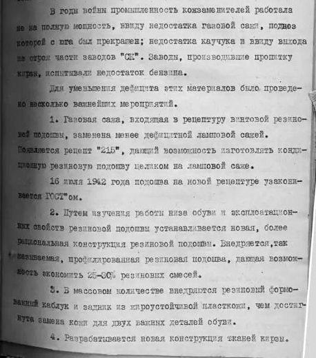 Техническим Комитетом Главного Интендантского Управлением, совместно с Вещевым Управлением и предприятиями промышленности, была проведена воистину гигантская работа. В кратчайшие сроки была разработана новая рецептура для резинового низа обуви, внедрён резиновый каблук и новая резиновая подошва[1]. В дело пошли даже отходы корда и использованные автопокрышки. Из них, причем во фронтовых условиях, изготавливались подмётки и другие детали низа, чем экономился дефицитный каучук.