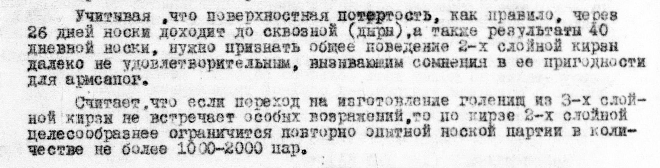- Нет никаких оснований отказываться от организации сравнительной опытной носки, которая позволила бы проверить возможность использования такого типа обуви, напротив необходимо ускорить организацию опытной носки сравнительной сапог с голенищами из «кирзы СК» и брезентовыми голенищами, а также ботинок с обмотками.
