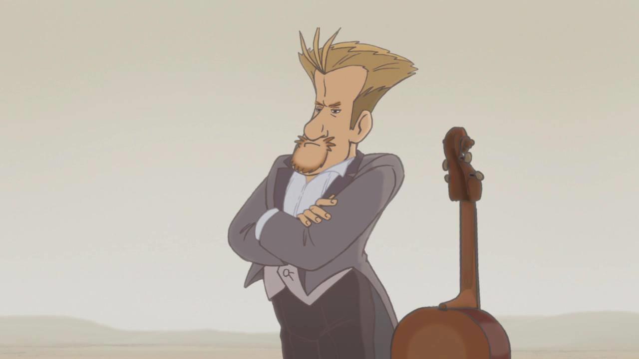 Берёт свою виолончель и удаляется в пустыню, на одинокий холм, где занимает позу одинокого, непризнанного гения.