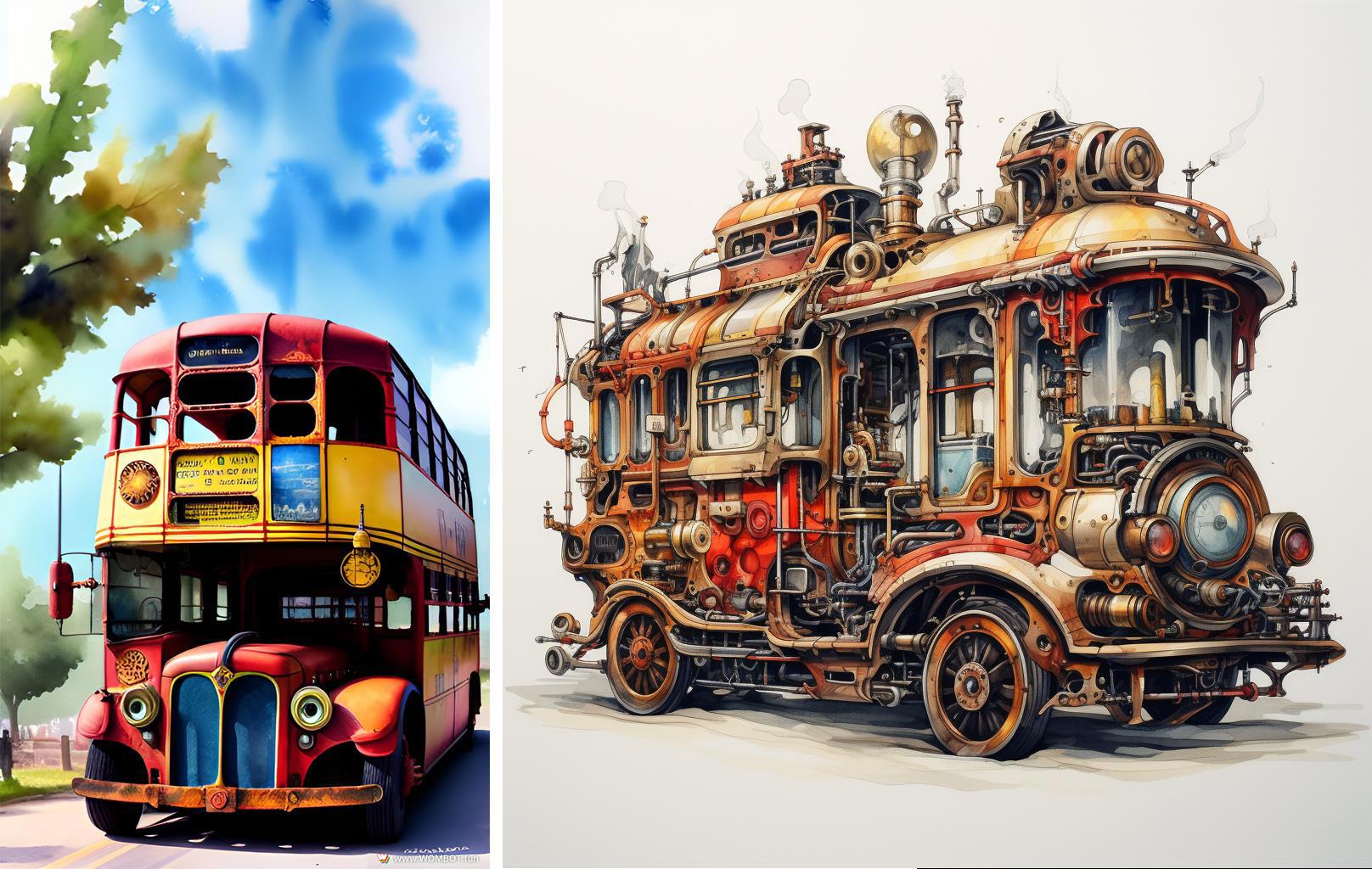 steampunk bus, watercolor