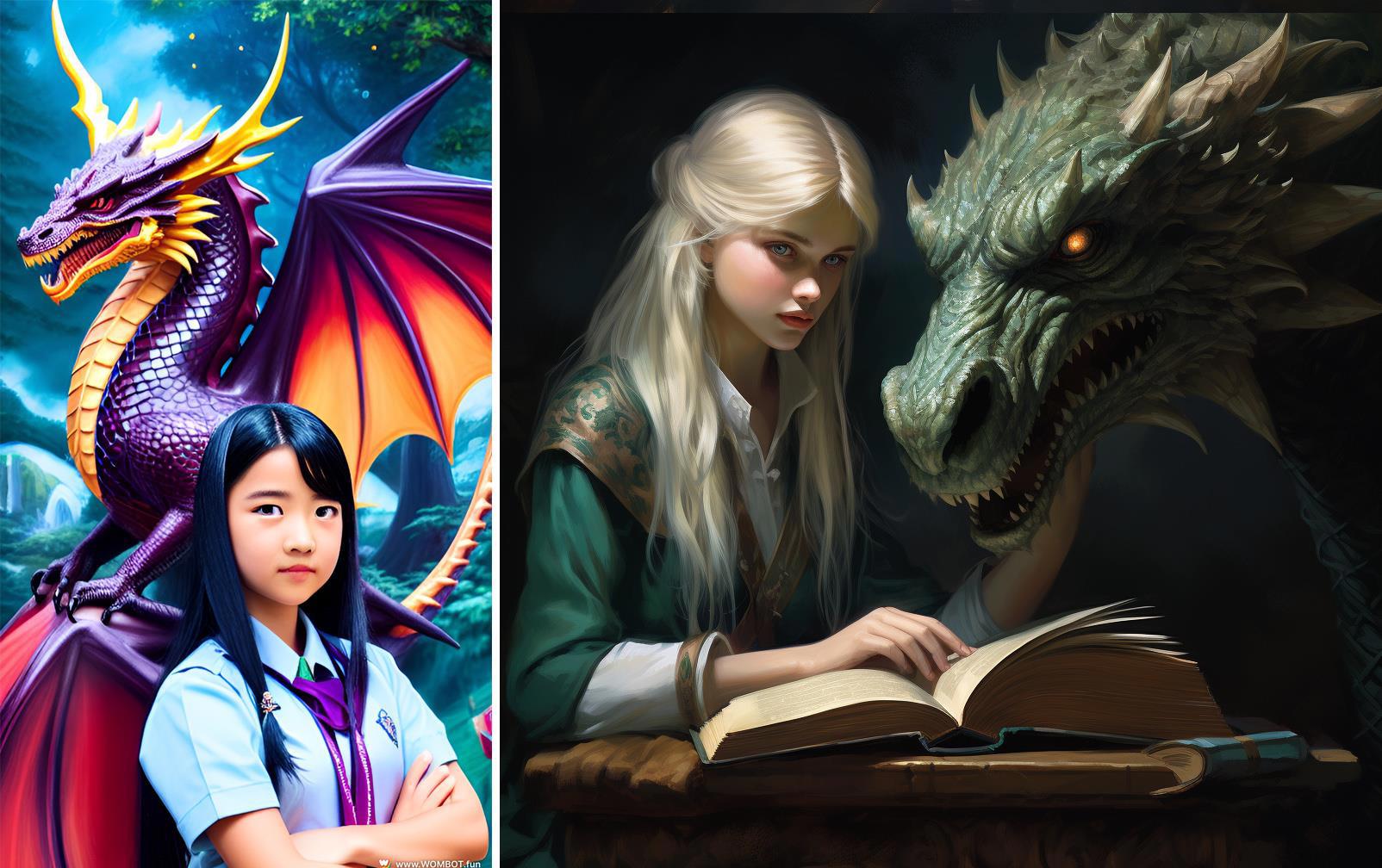 dragon as a head of magical academy and female student, painting