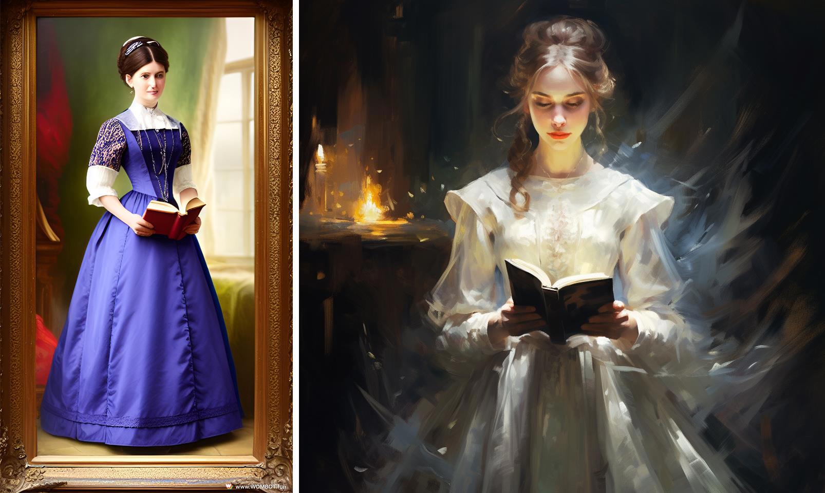 victorian lady in modest dress with magic book, oil brush strokes