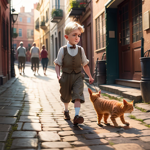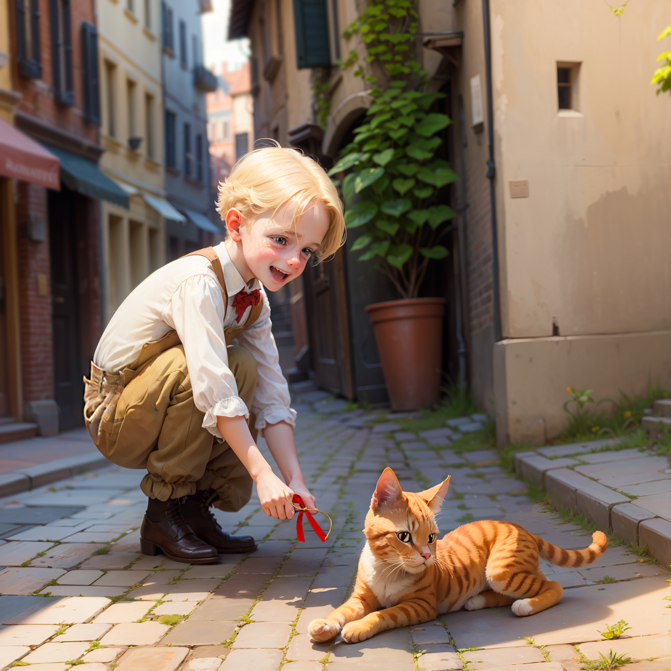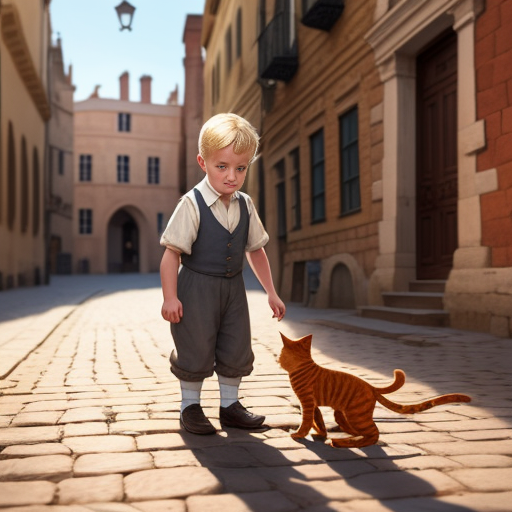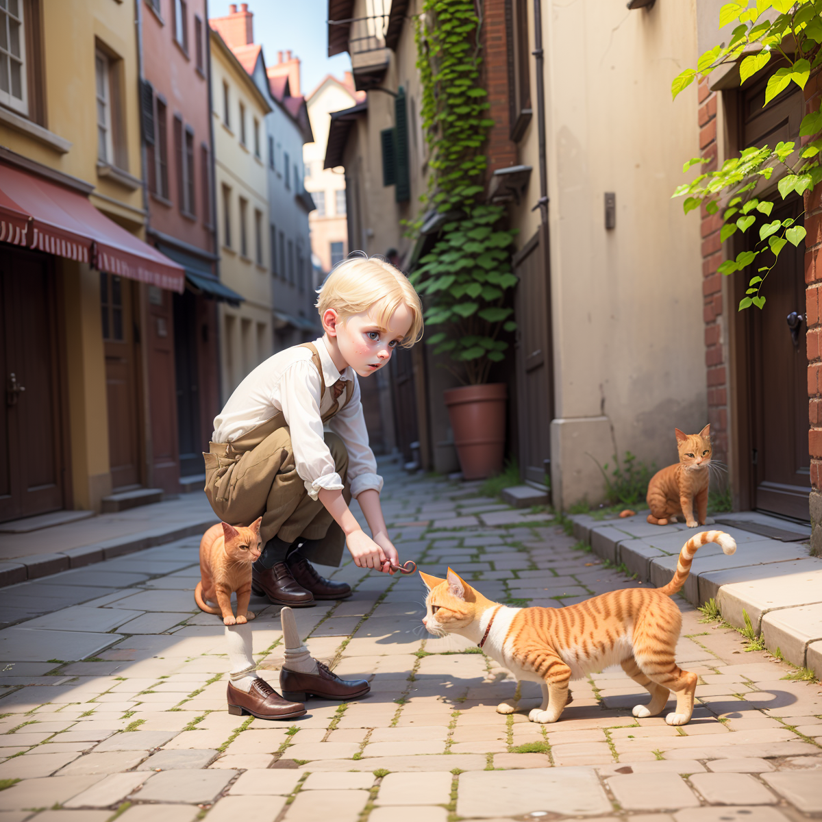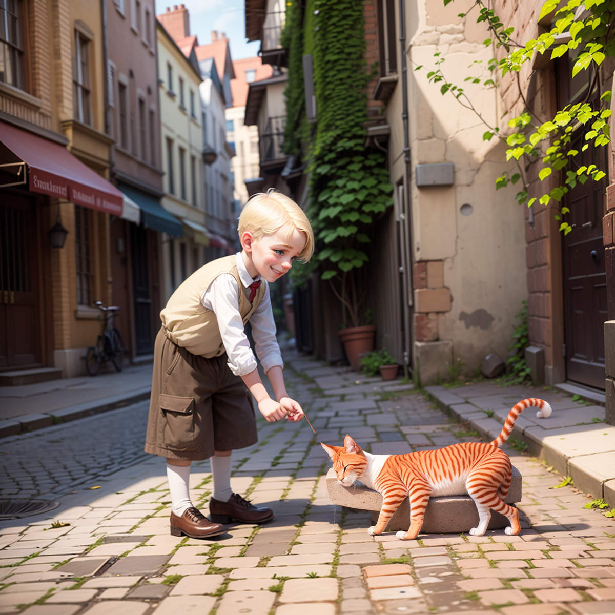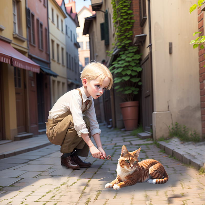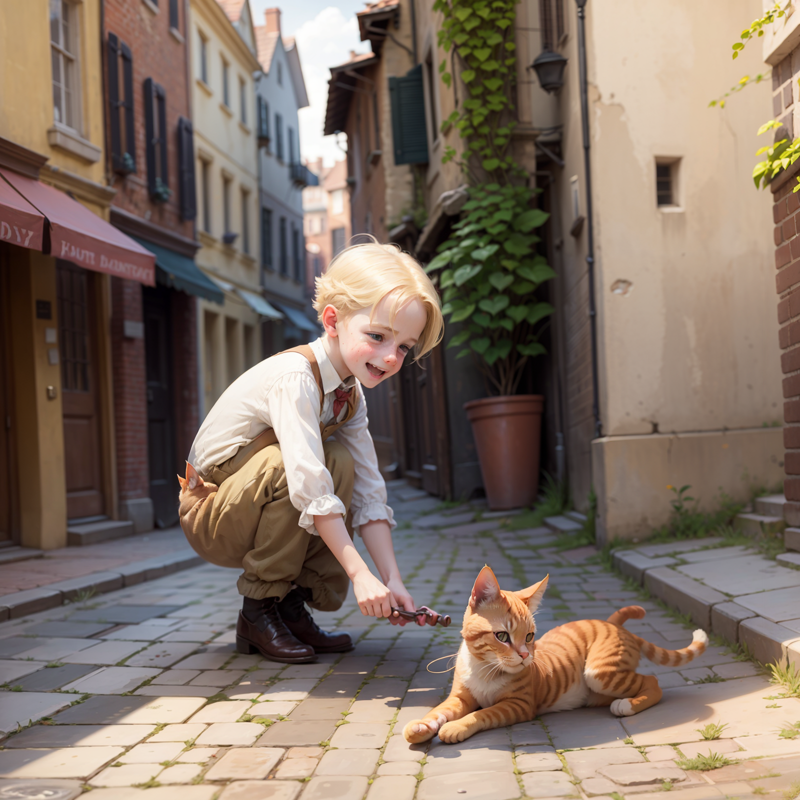 Для начала пишем простое заклинание типа "Мальчик играет с котом на улице славянского города начала 20 века, лето, солнце, лепота" (на английском, само собой). Почему "славянский"? На слово "российский" SD моментально рисует купола и красные звёзды. Ей виднее, но нам это не надо. Получаем на выходе некоторое количество всратых мальчиков и котиков-мутантов. Примерно таких: