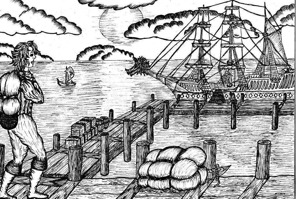 На этой картинке она невероятно точно подметила все, что было в тексте, вплоть до времени суток и дремлющего у корабля старичка. И ГГ она классно представила - наивный вьюнош, мечтающий о приключениях :)
