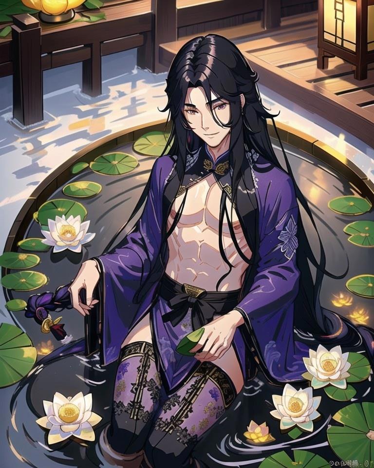 А вот еще для "Безмятежного лотоса" картинки) Тут был в запросе китаец в распахнутом ханьфу в горячих источниках с лотосами, а ИИ чулки дорисовал по собственной воле: