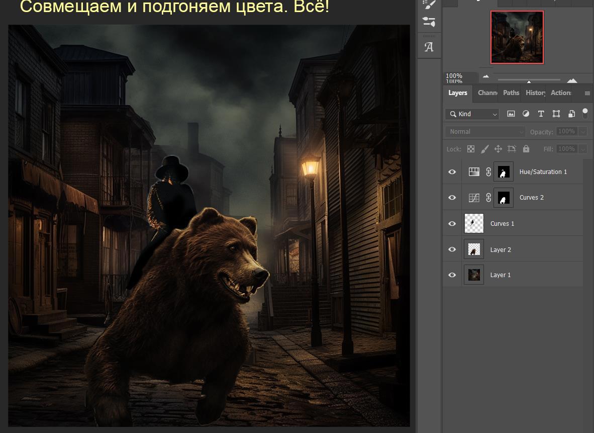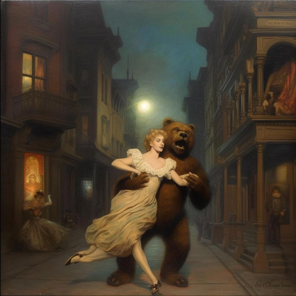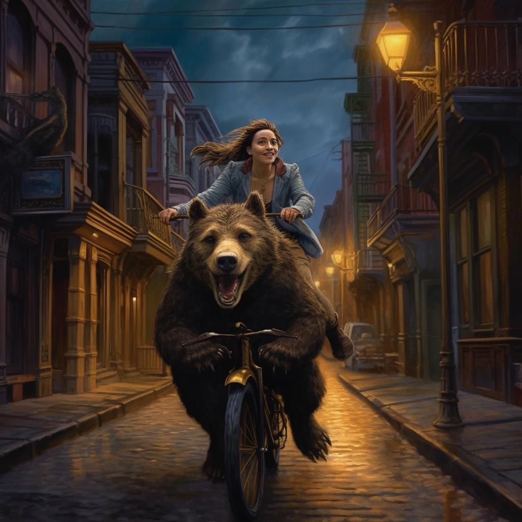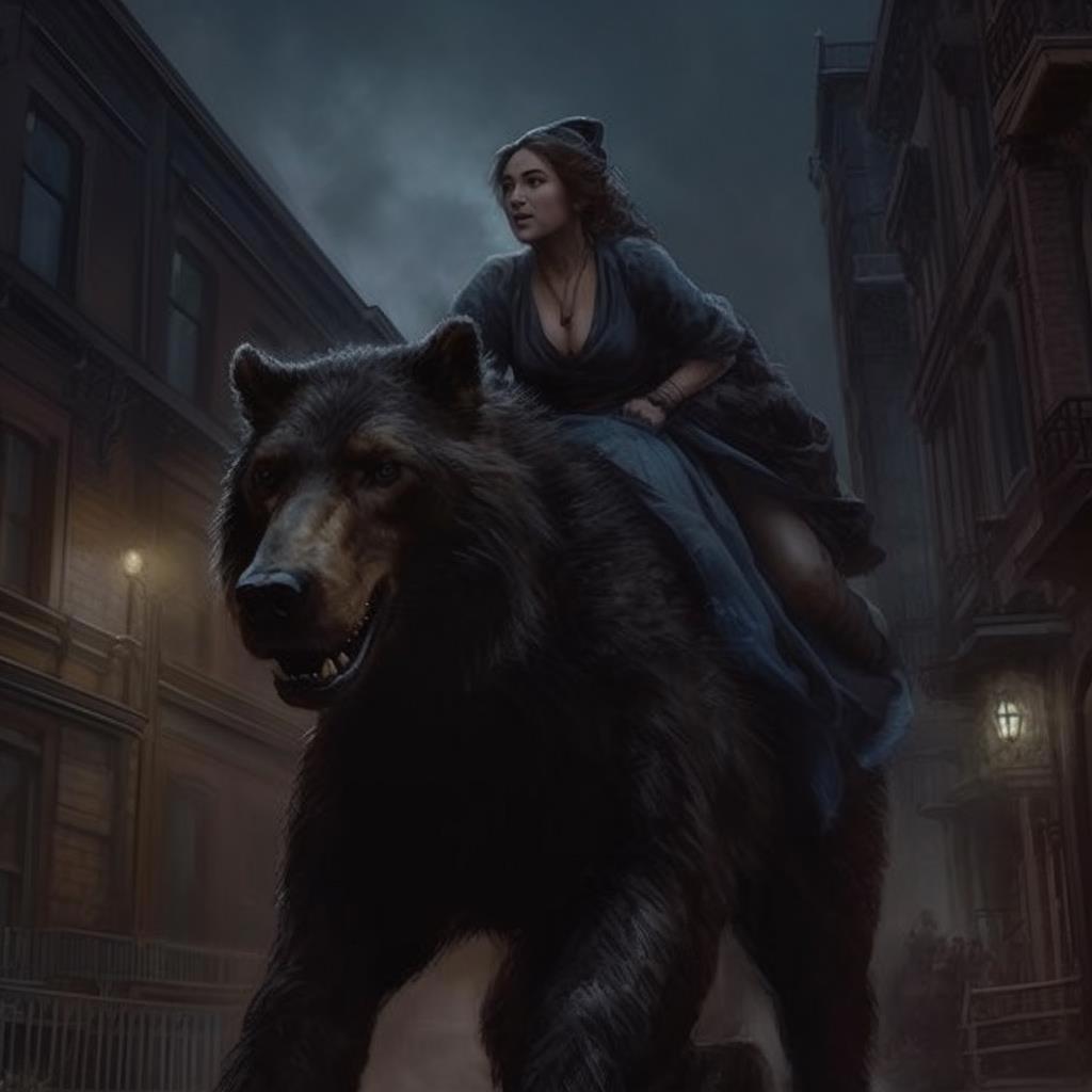 Я в разных вариантах комбинировала женщину, верхом, медведя, ночь и трущобы.