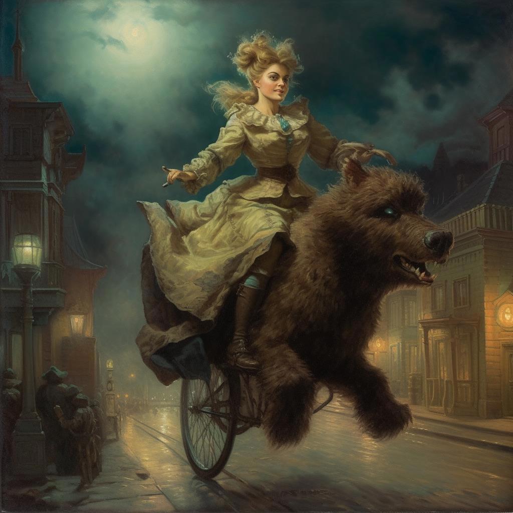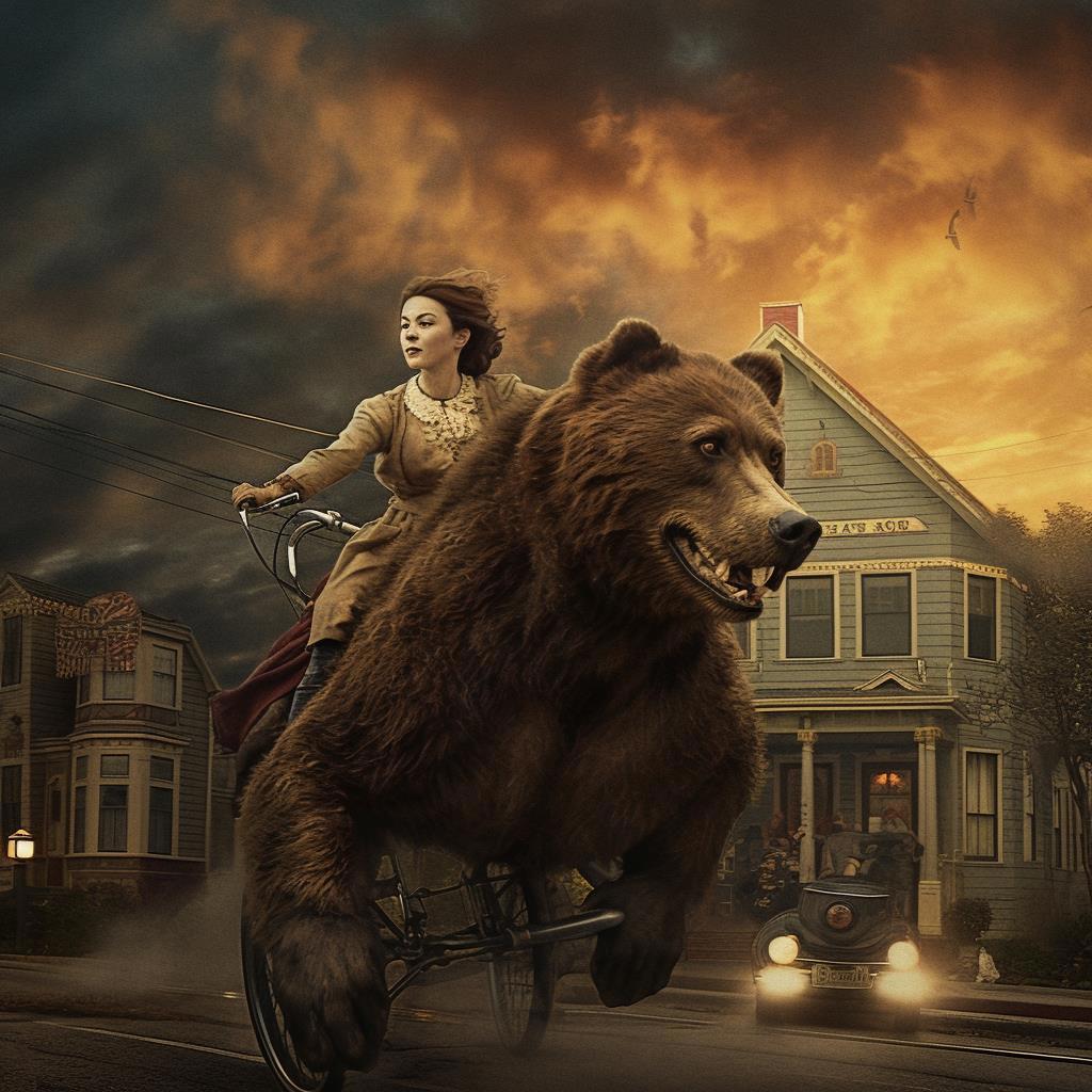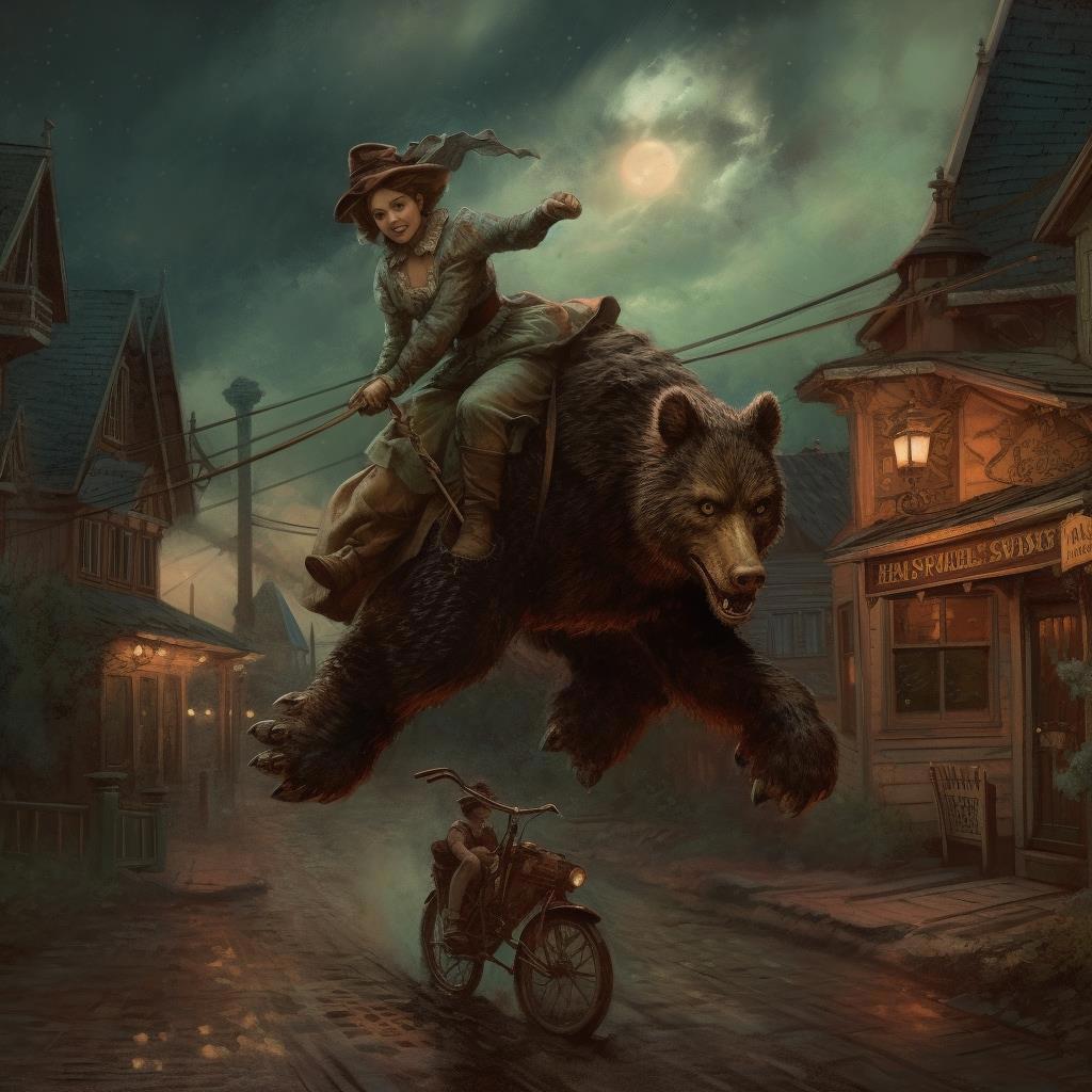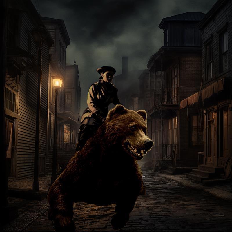 Задача: женщина в одежде девятнадцатого века скачет верхом на медведе по городским трущобам.