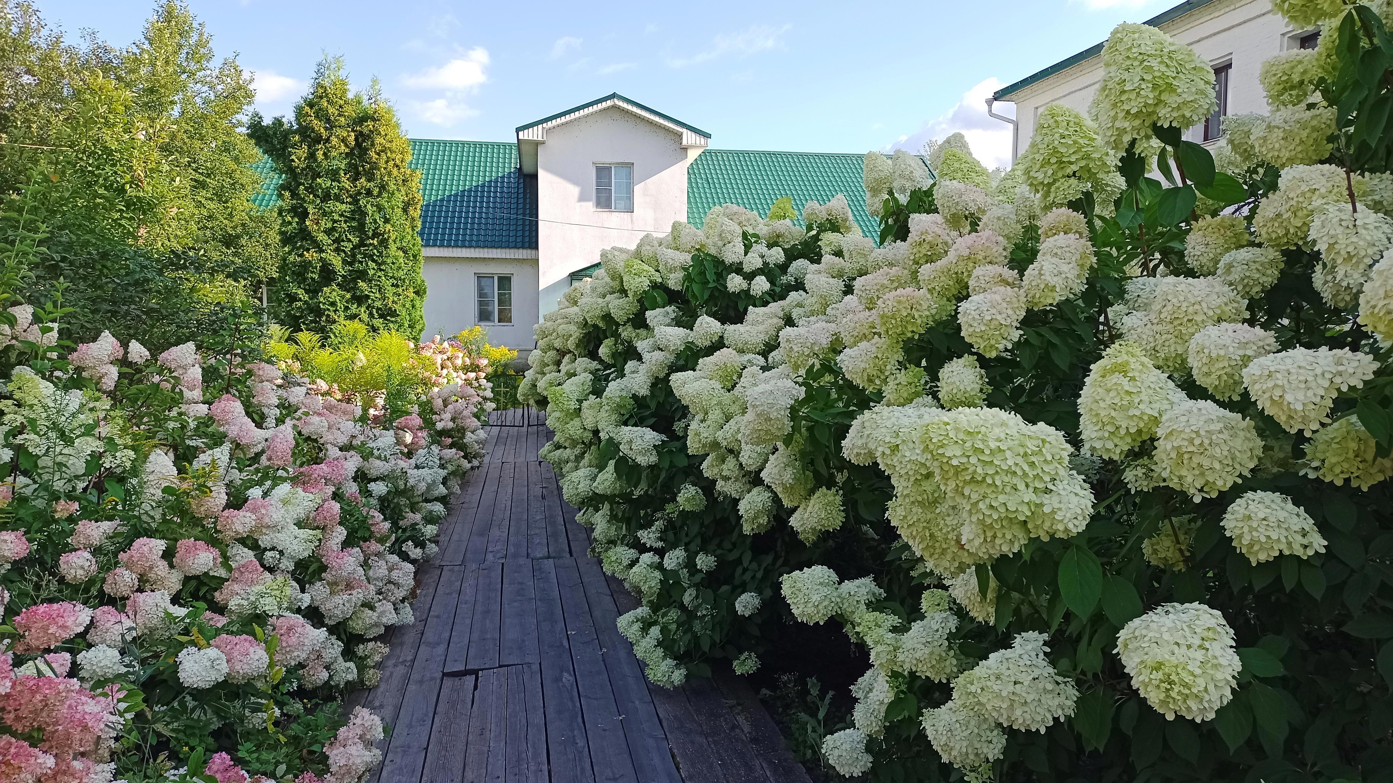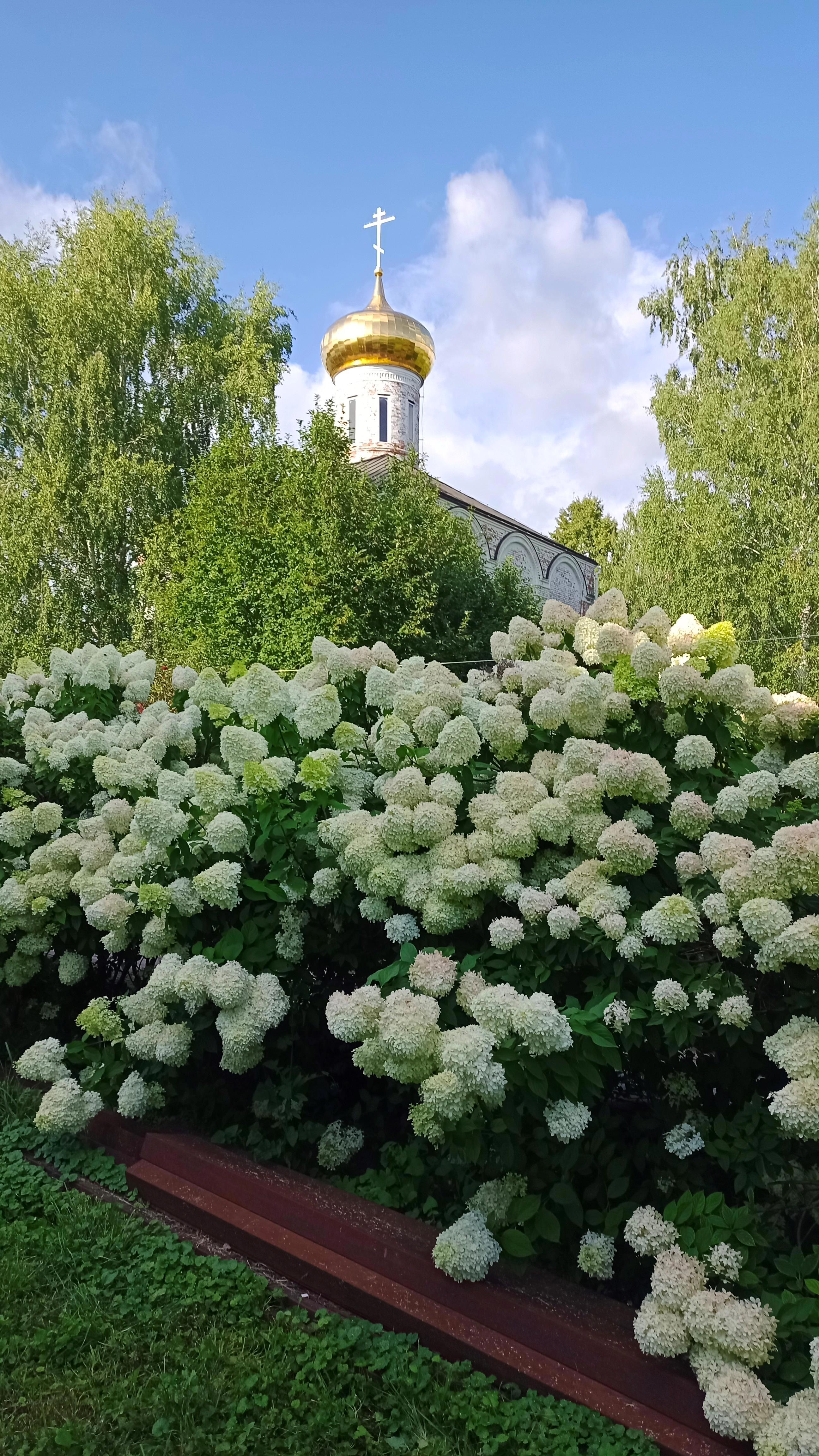 В монастыре повсюду растут какие-то необычно большие пышные гортензии.