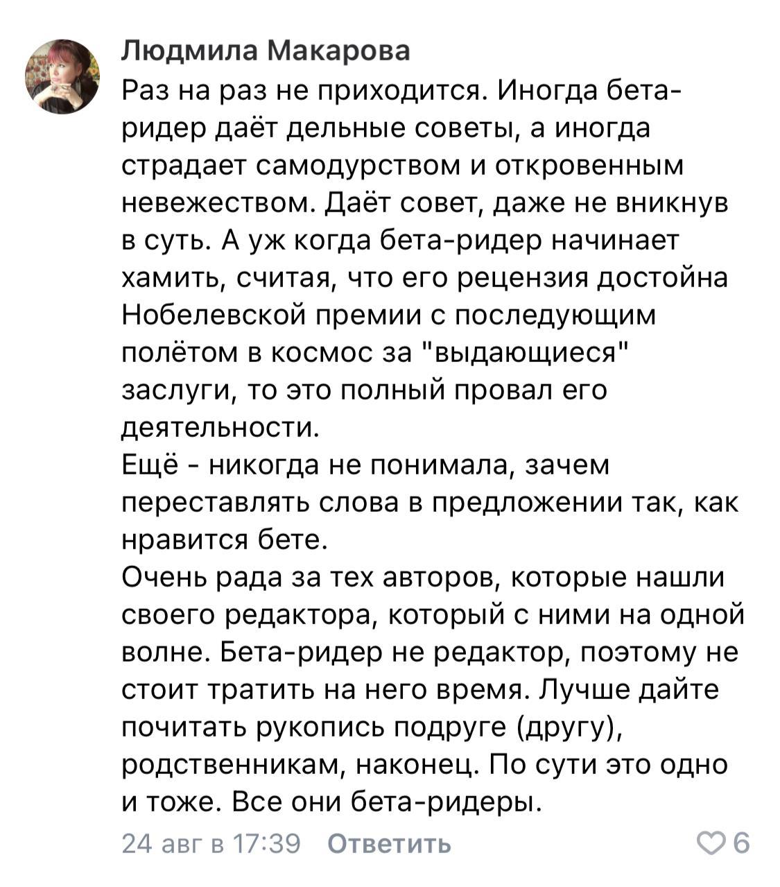 Поверьте, если сравнить варианты по расстановке слов в предложениях от редактора и бета-ридера, они будут отличаться. Редактор порекомендует «как верно» в рамках правил, бета-ридер скажет как написать, чтобы читатель понял, разобрался, дошёл до сути и не задохнулся, вычитывая километры слов.