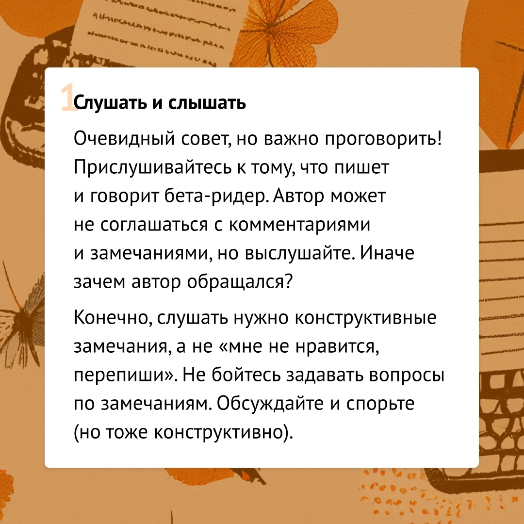 «Переставлять слова в предложениях так как слышит бета-ридер» — это значит позаботиться о читателях. Бета-ридер — читатель, способный сформулировать эмоции и мысли от прочитанного.