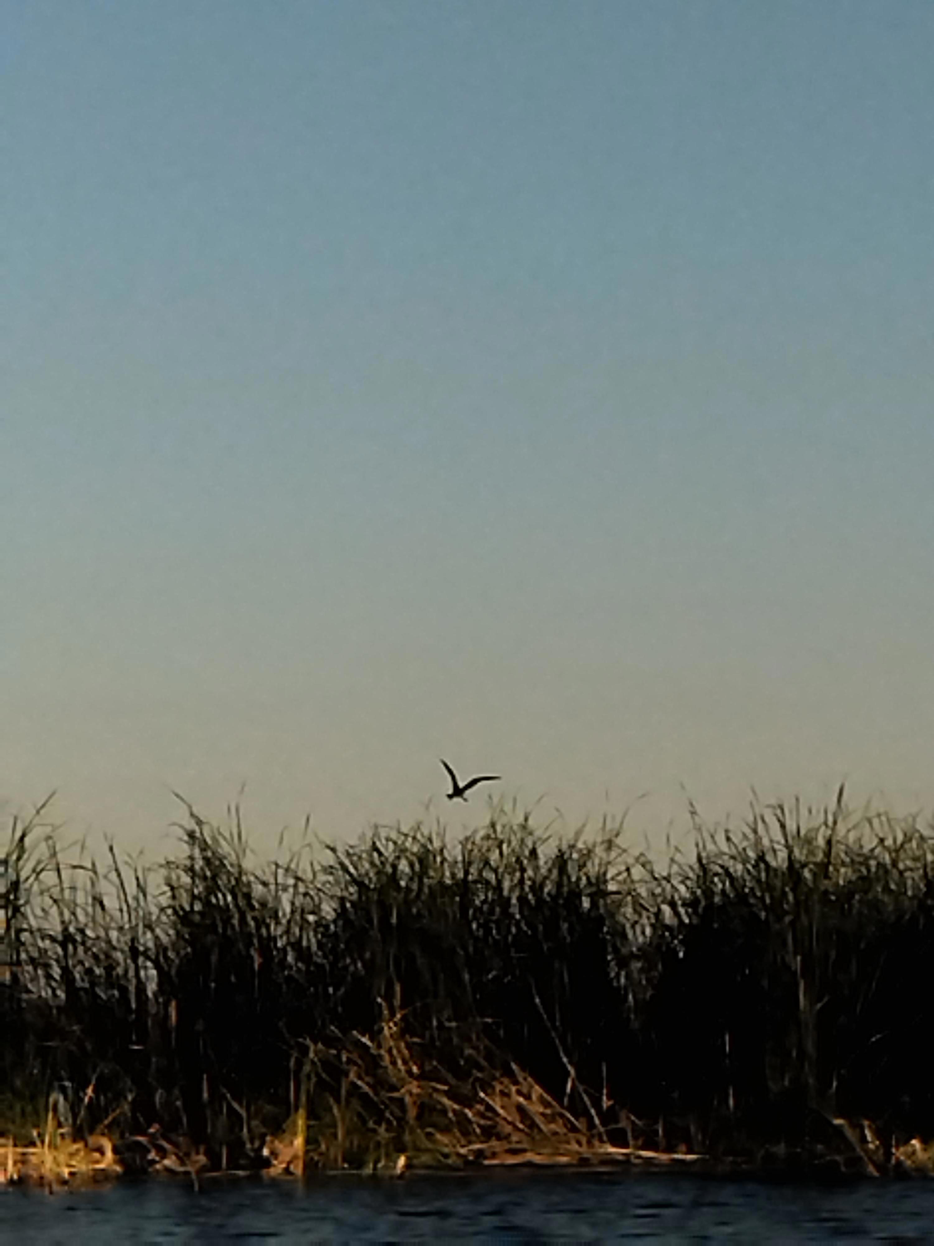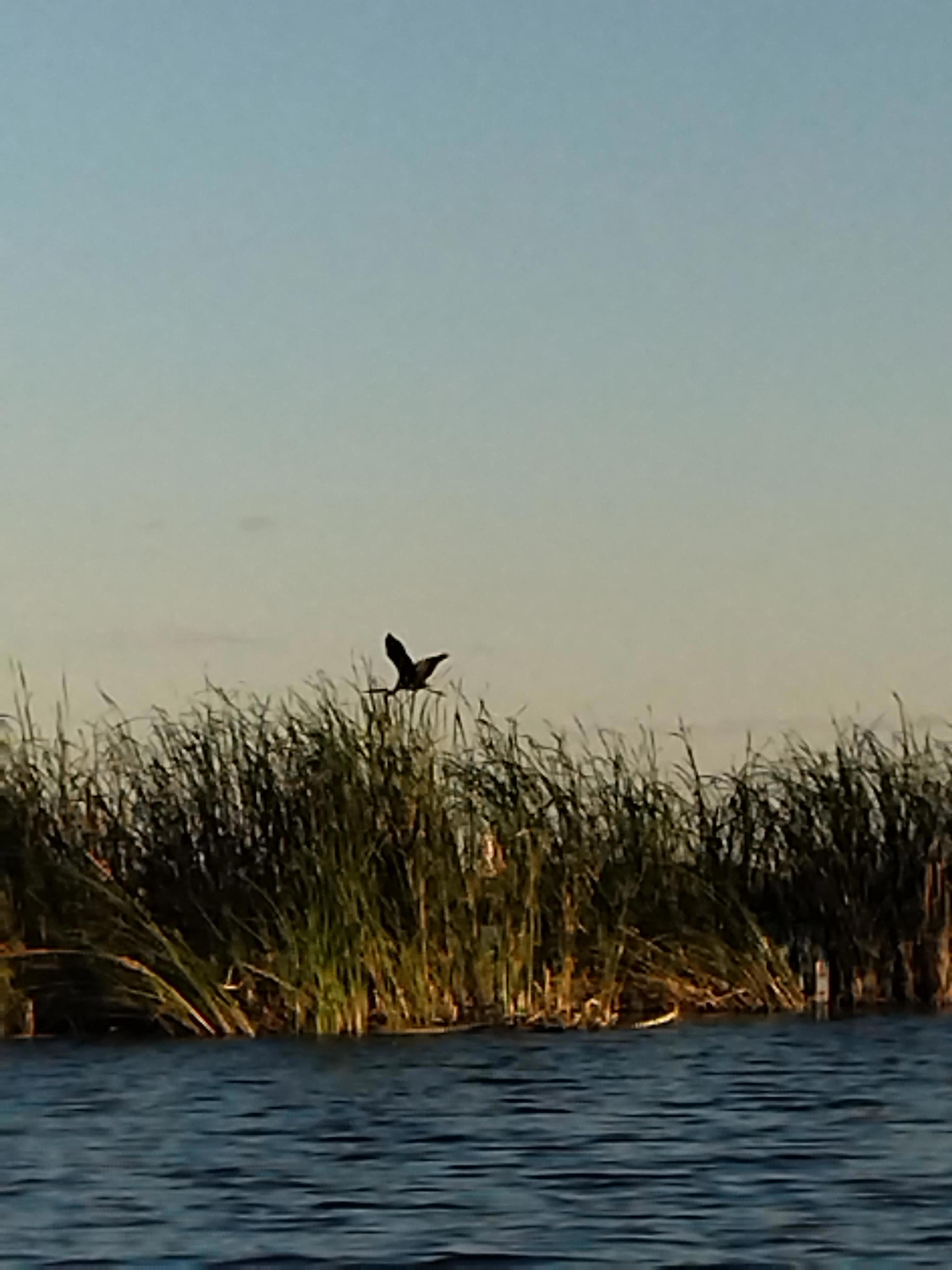 Цапля, взлетевшая при нашем приближении. Какое-то время она пыталась прикинуться кустиком, замерев на одной ноге, но слишком близко к себе не подпустила.