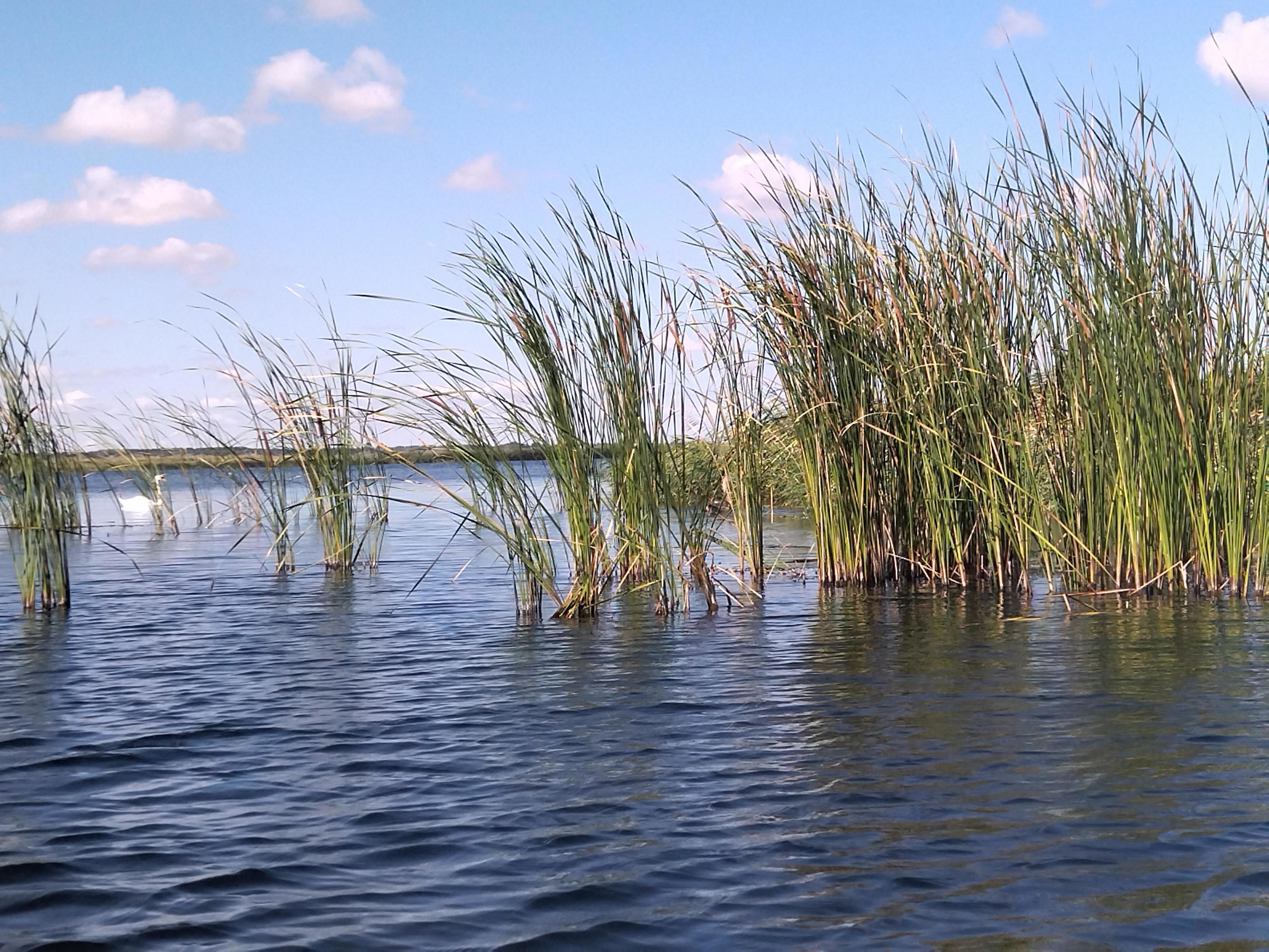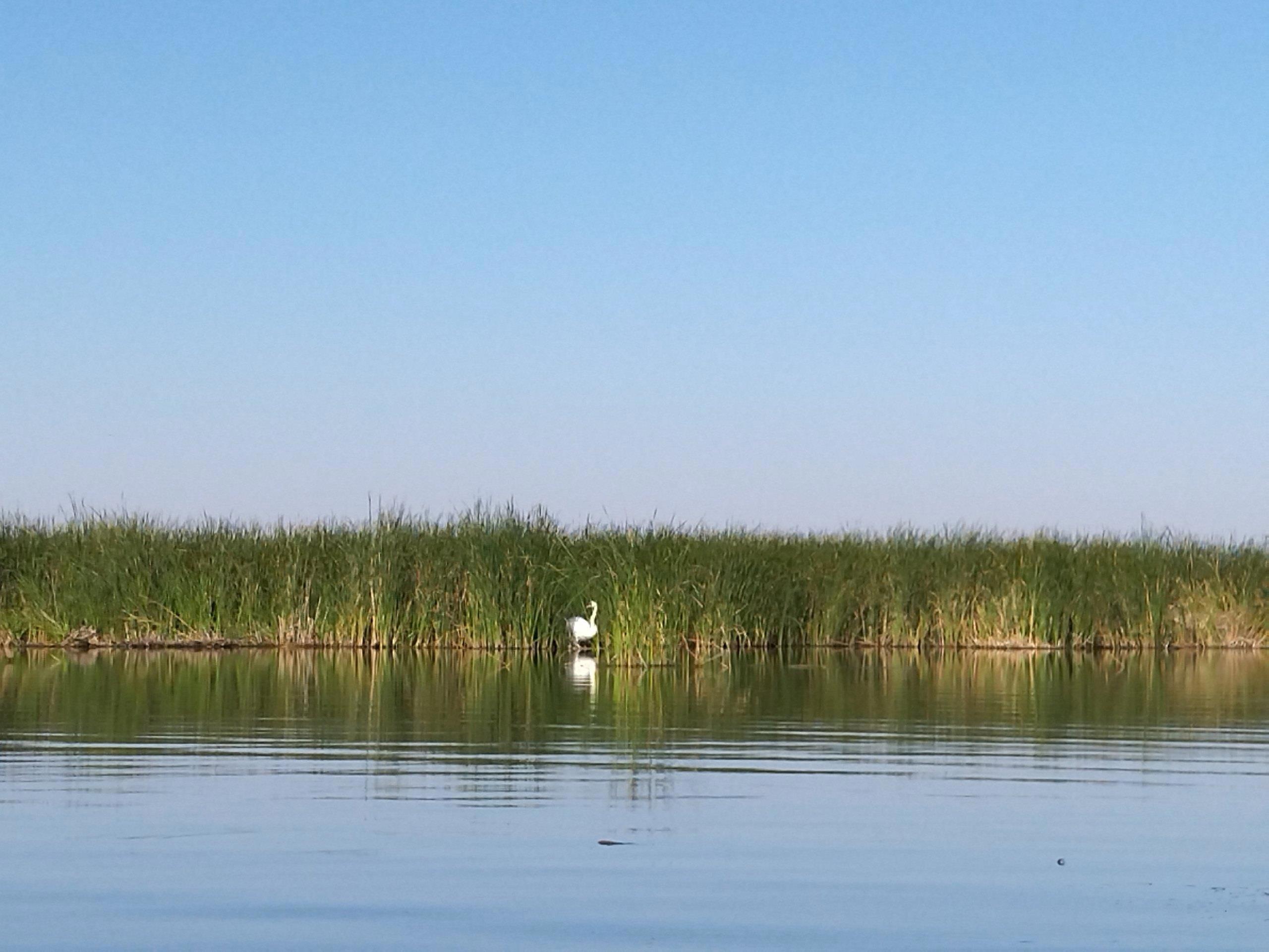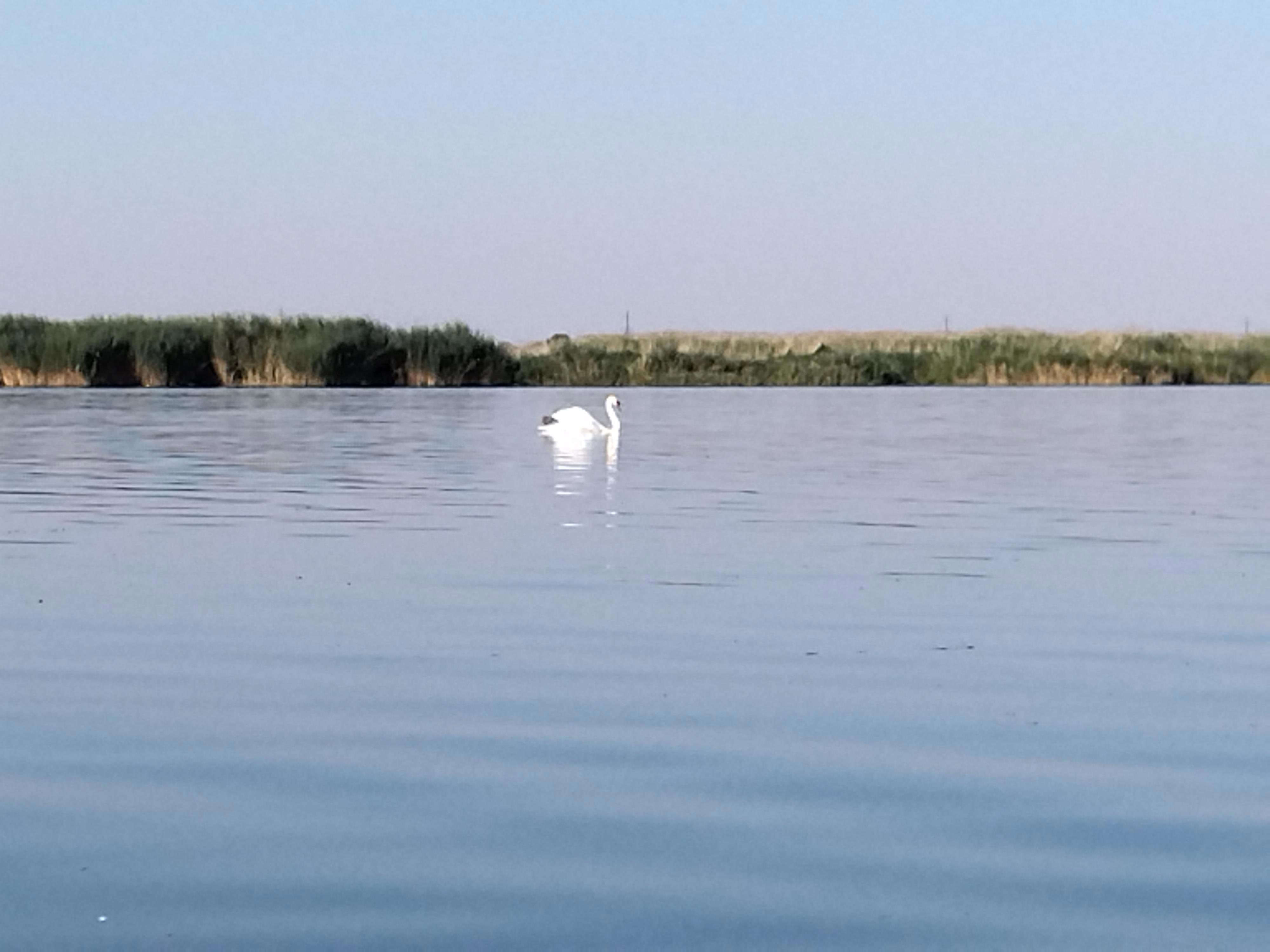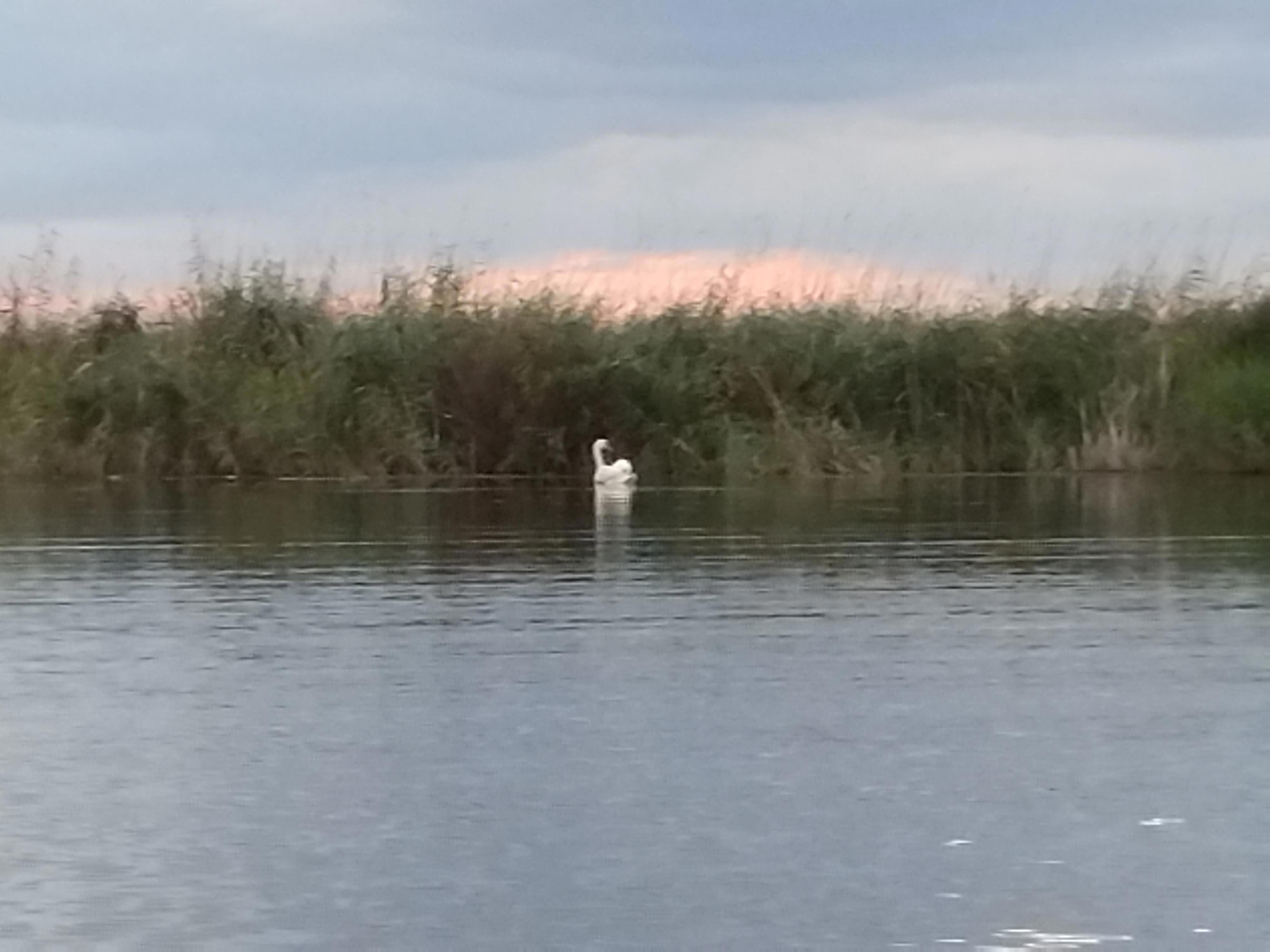 Лебедь на своей лёжке, скрытой в камышах плавучего острова. С лёжки собрали много выпавших перьев - пойдут на ловцы снов, которые плетёт жена. На водохранилище обитают в основном утки да цапли, с небольшим количеством орлов, но в этом году пара лебедей вывела и вырастила трёх лебедят. Сейчас они уже вовсю меняют перья с серовато-коричневых детских на белоснежные взрослые.