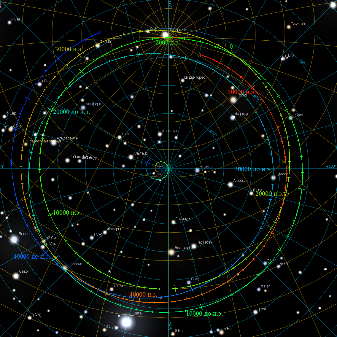 К слову, широты некоторых мест на карте определены более-менее верно, а некоторые смещены на несколько градусов. Объяснить это можно, скорее всего, тем, что замеряли их не по полюсу мира, а по полярной звезде, которая в средние века неплохо так люфтила из-за прецессии планеты. Полюс мира определяли на глаз и при помощи примитивных астрономических приспособлений. Об этом я уже многократно упоминал в предыдущих блогах. На этом изображении вы можете увидеть, как смещается полюс мира в зависимости от эпохи и где он был относительно полярной звезды в позднем средневековье, когда создавалась эта карта.