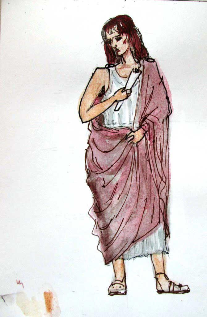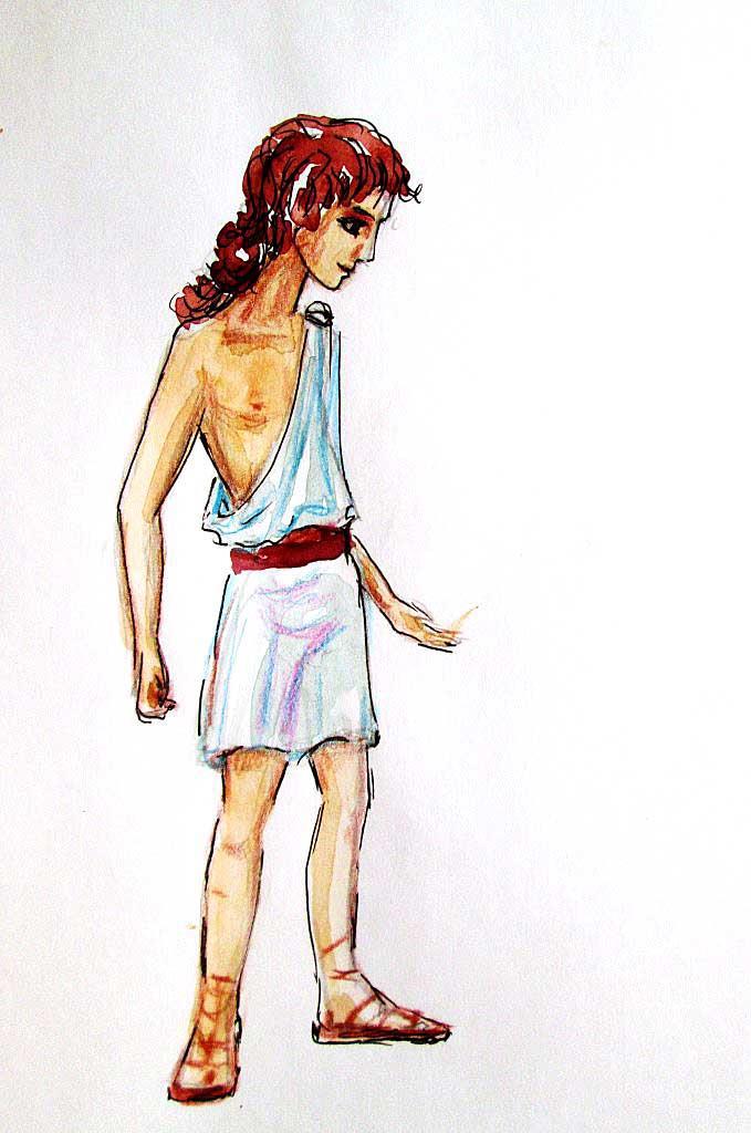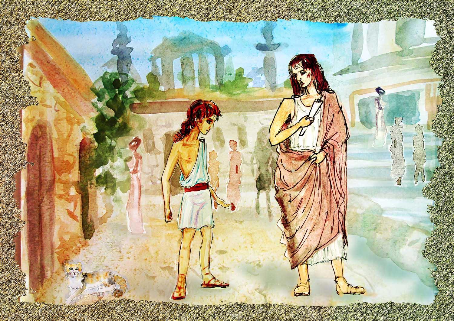 Мне не нужно было читать весь роман, была предложена 2 глава. Она начиналась со сцены на городской улице со встречи двух героев - подростка (мальчика) и юноши. Мальчик передавал похищенное письмо. Так как я читала не сначала, то мне трудно было точно представить возраст и внешний облик персонажей. Может быть поэтому они не совсем соответствуют представлению автора и читателей. Хотя я прочитала всю главу, но именно эта сцена встречи мне запала. Я представила солнечную улицу античного города и так как мир, представленный в романе, довольно светлый по настроению (по сравнению с прошлой встречей, где были легионеры и распятые восставшие), то и иллюстрация должна была стать цветной, в цветах солнца и песка.