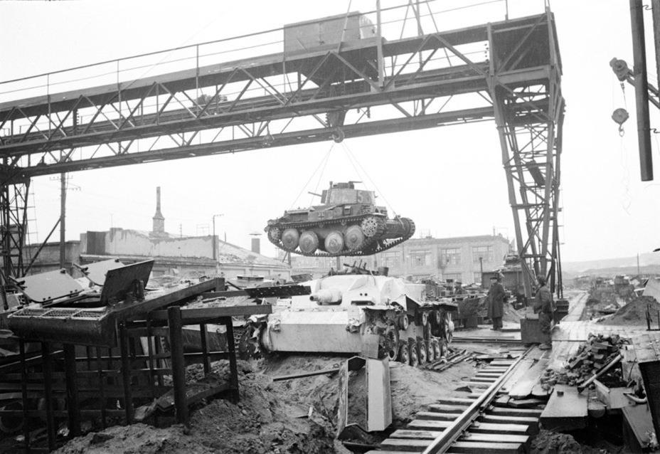 Виден Штуг с "окурком" и чешский танк на кране. Может быть вы сможете сказать, что за техника на фотографии. На фоне левой опоры крана, с тремя открытыми люками (кусок брони с открытым моторным отсеком).