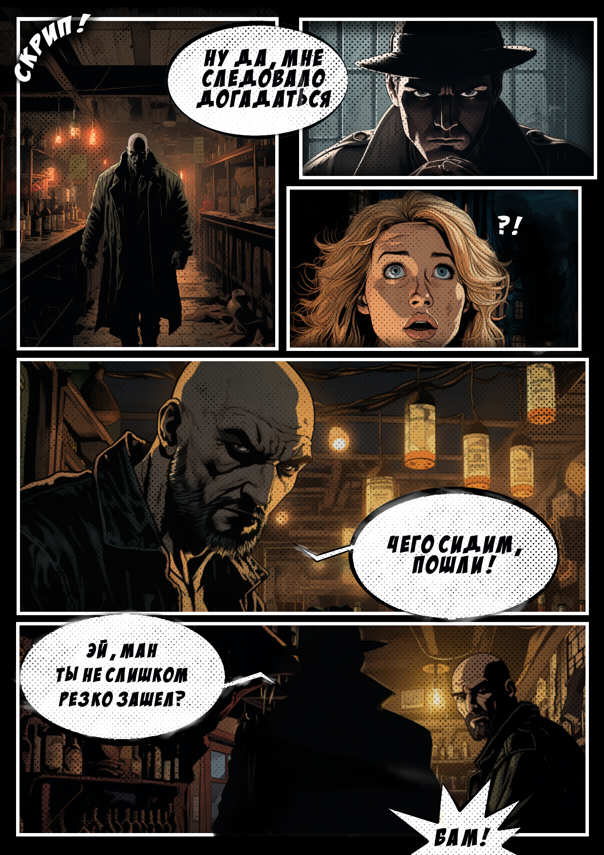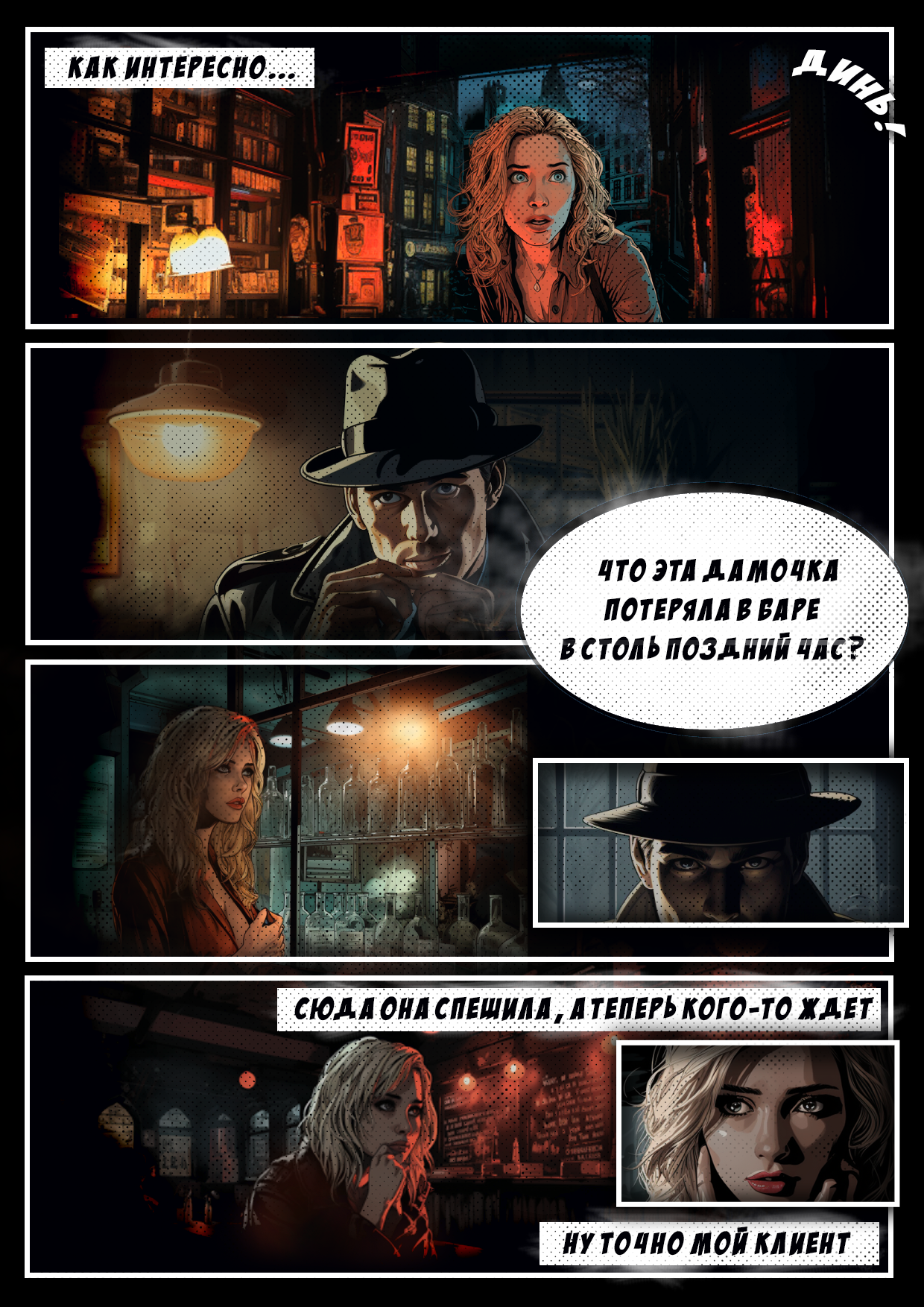 Ну, и самое главное, что за комикс, о чём комикс, почему детектив не пьющий и так далее. Жанр, очевидно, нуар, то есть страна вечного сумрака и полуночных баров, виктимные блондинки, загадочные события и много драмы:
