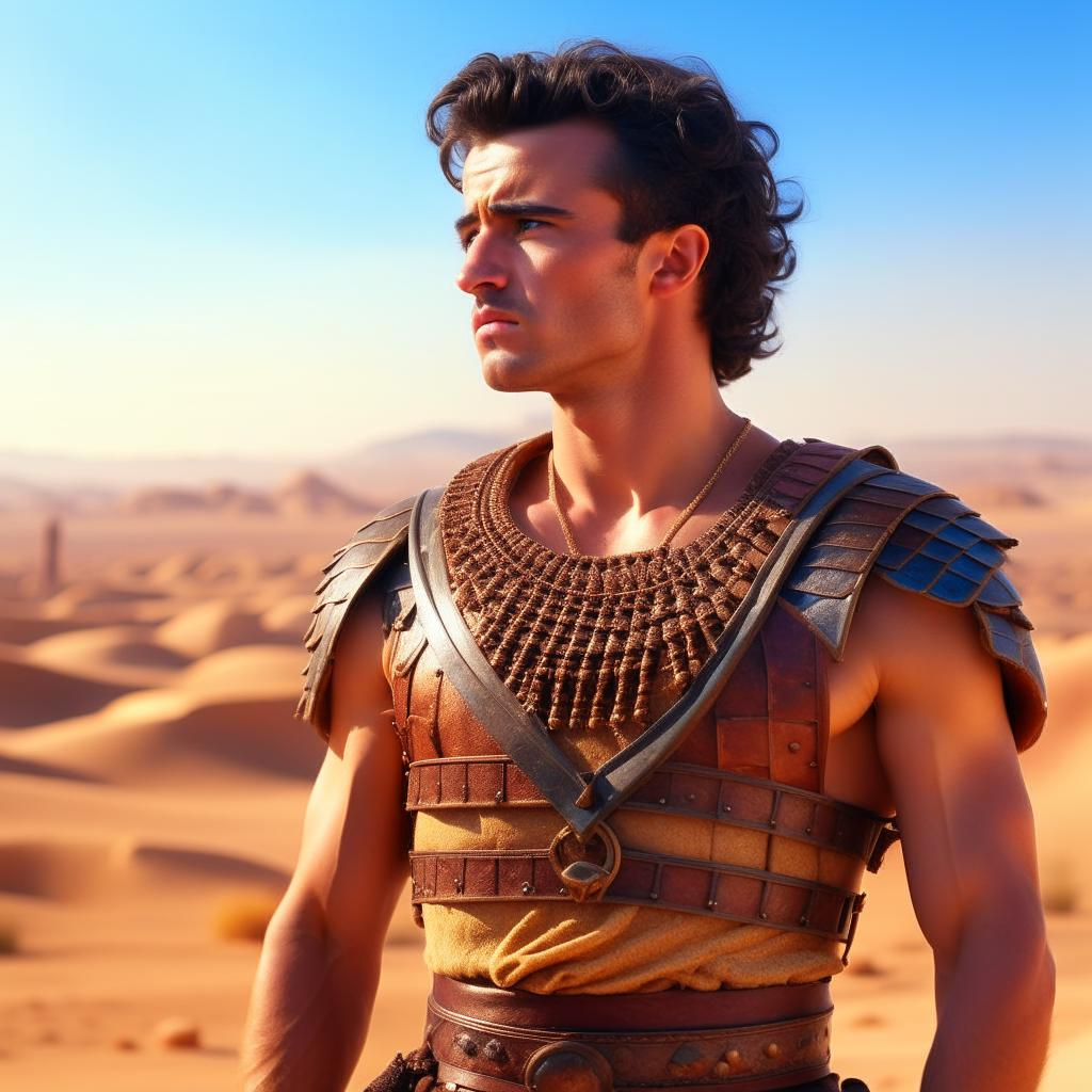 А вчера же я решил поколдовать над образом персонажа из романа «Клубок со змеями» и задал сетке следующий запрос — «юноша из древнего вавилона в кожаном нагруднике стоит на фоне пустыни».