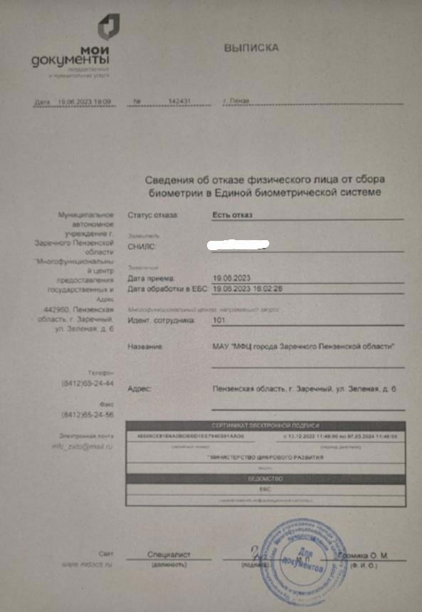 И всё!!! Вот только это филькина грамота оказывается на руках у некоторых обратившихся в МФЦ для подачи заявления об отказе от сбора и распространения биометрических персональных данных!